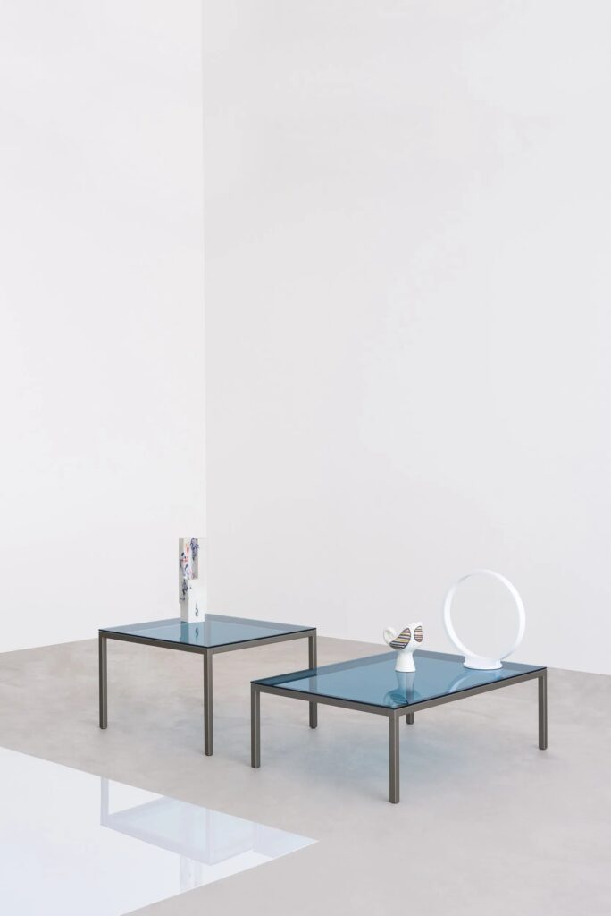 System von Tischchen mit Stahlgestell, Querschnitt 30x30mm und Verbindungselementen aus Druckguss. Gestell in den matt lackierten Ausführungen oder in den exclusiven Desalto Ausführungen. Platten aus Glas, Fenix® Laminat, Schichtlaminat, Keramik.
