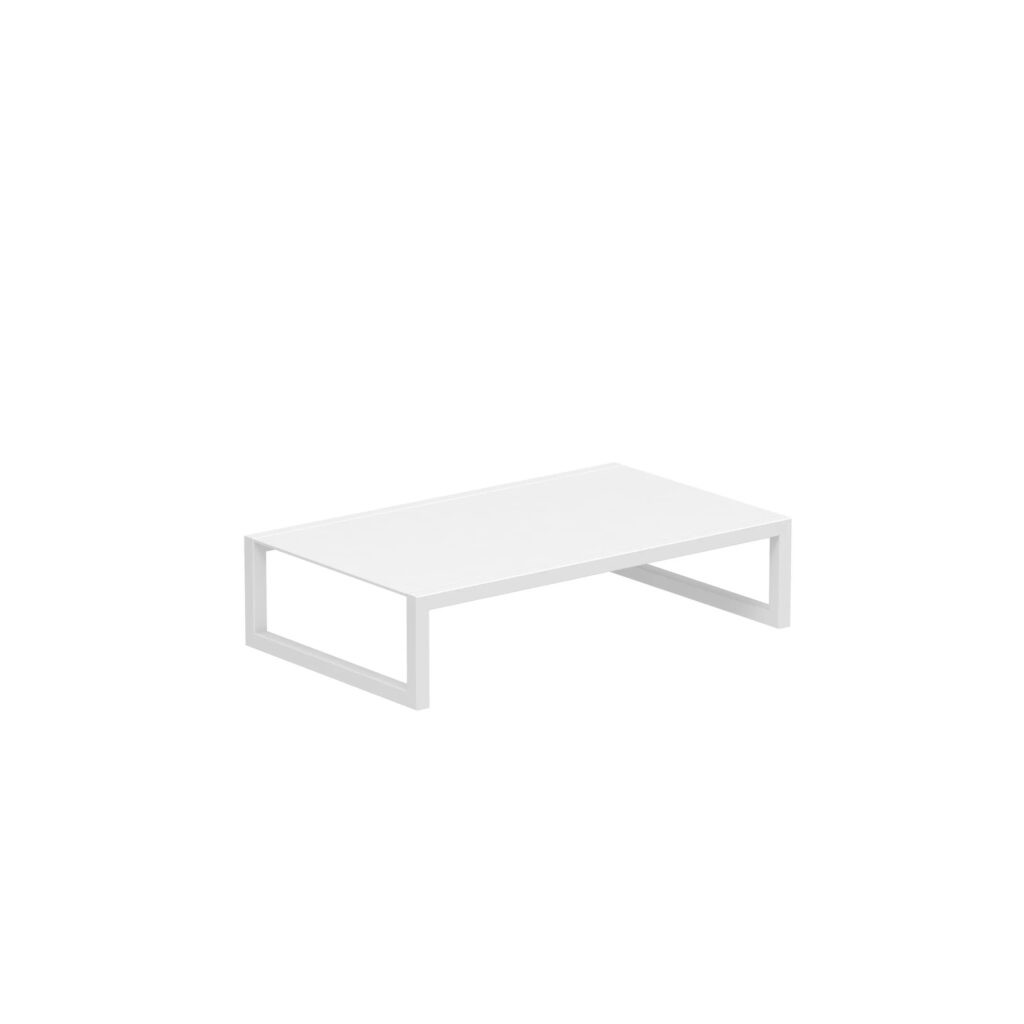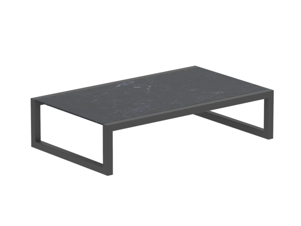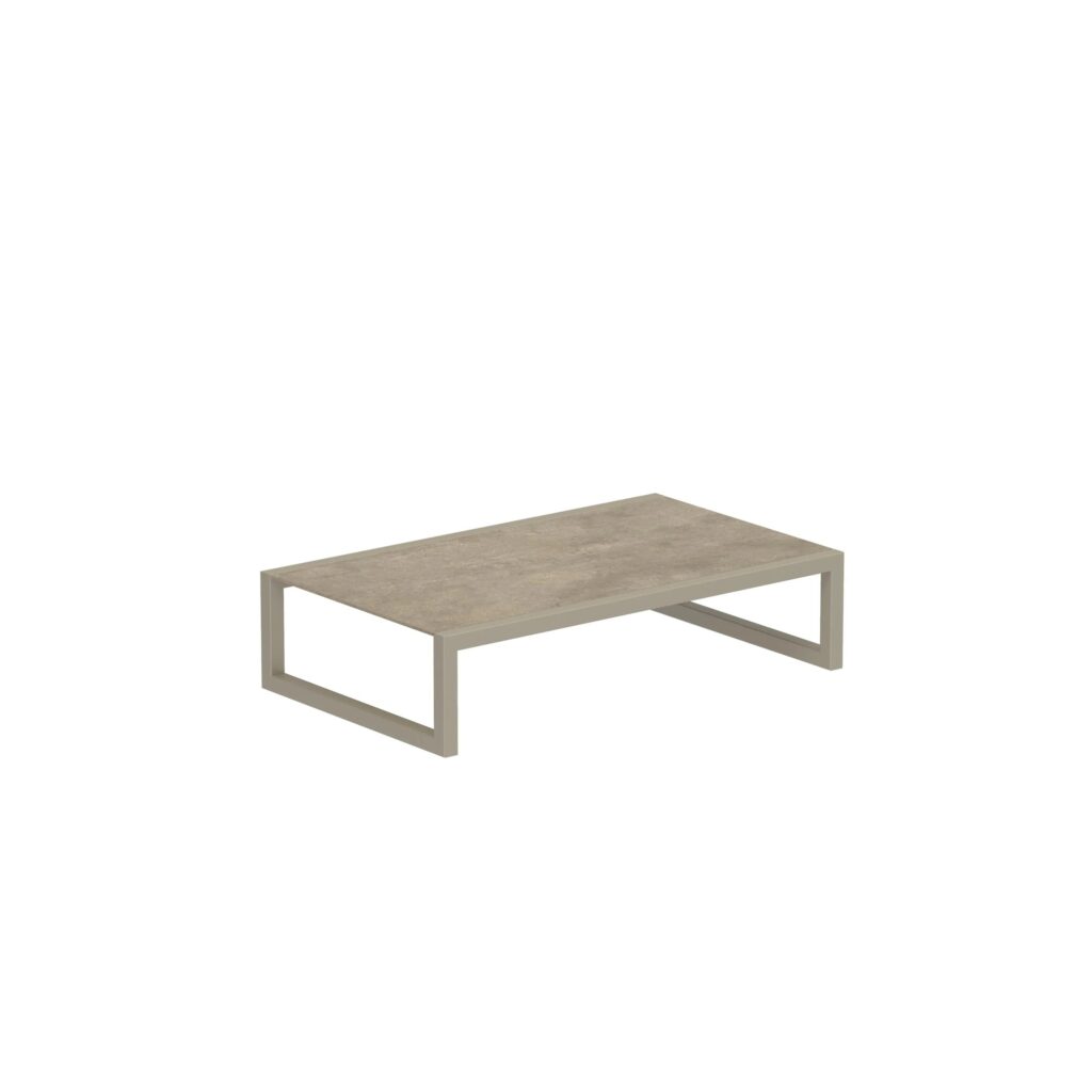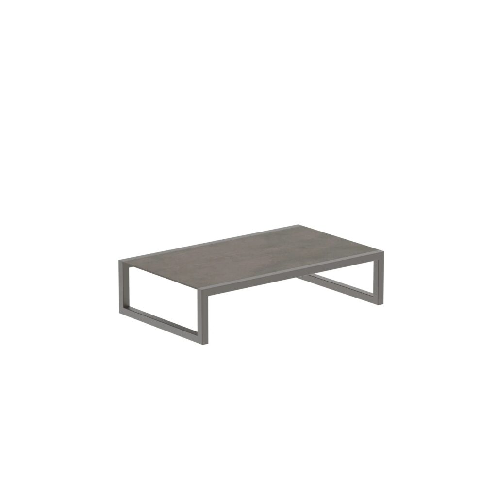 Ninix ist ein niedriger rechteckiger Gartentisch mit Kufengestell aus Edelstahl und Glas- oder Keramikplatte aus der NINIX-Kollektion.