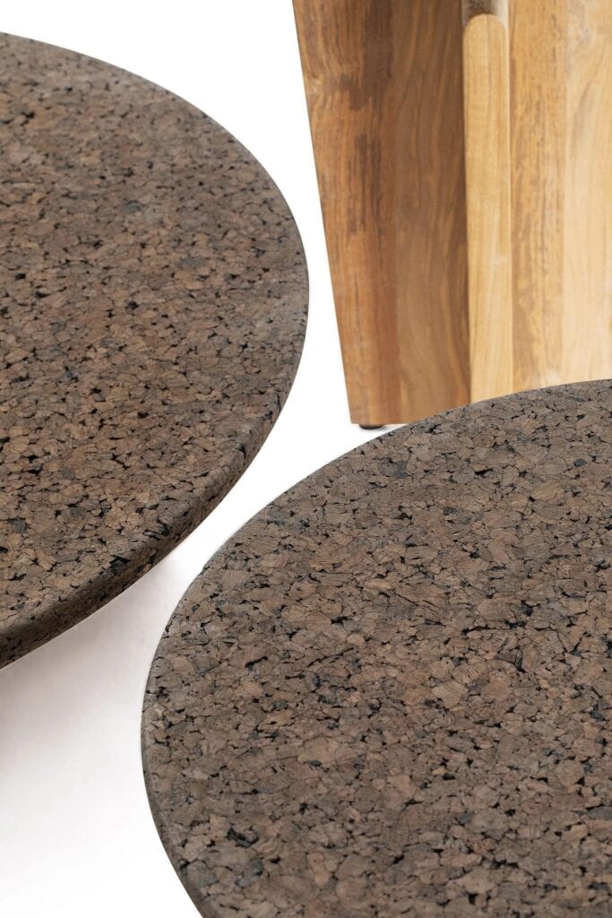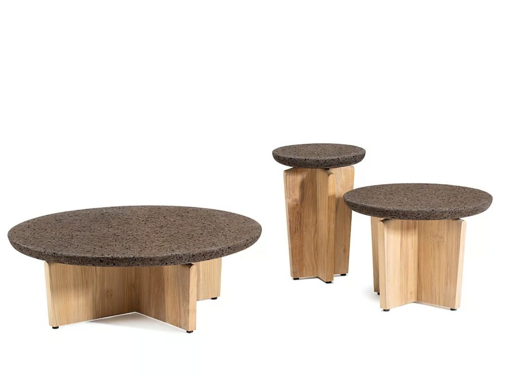 Die niedrigen Tische Cross haben Untergestelle und Platten aus natürlichen Materialien wie FSC-Teakholz und , letzteres erhält seine Farbe, Textur und Haltbarkeit durch eine spezielle, 100% umweltfreundliche Behandlung. Erhältlich in drei verschiedenen Grössen (mit einem Durchmesser von 100 cm und einer Höhe von 33 cm, einem Durchmesser von 60 cm und einer Höhe von 43 cm sowie einem Durchmesser von 40 cm und einer Höhe von 54,5 cm), sind diese neuen Couchtische eine ungewöhnliche Art, das Leben im Freien zu geniessen, indem sie ihre Form und ihr Material der natürlichen Umgebung entlehnen.