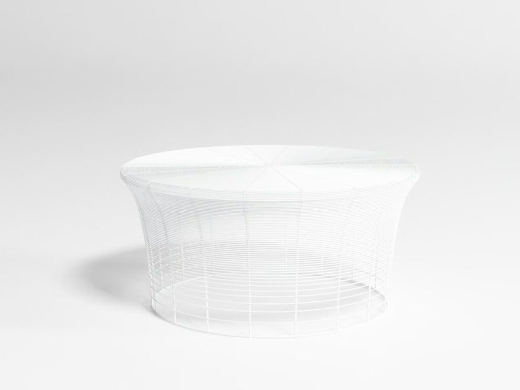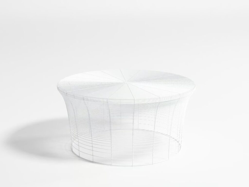 “Diese Kollektion von Hockern und Beistelltischen wird mittels der in Indien traditionellen Technik des Verflechten von Drähten rund um eine Struktur aus Metall hergestellt. Die zwischen den Drähten verbleibenden Zwischenräume werden schrittweise ausgedehnt, sodass ein Abstufungseffekt entsteht. Es handelt sich folglich um ein Design, das durch eine Änderung an einer schon vorhandenen Technik geschaffen wird.”