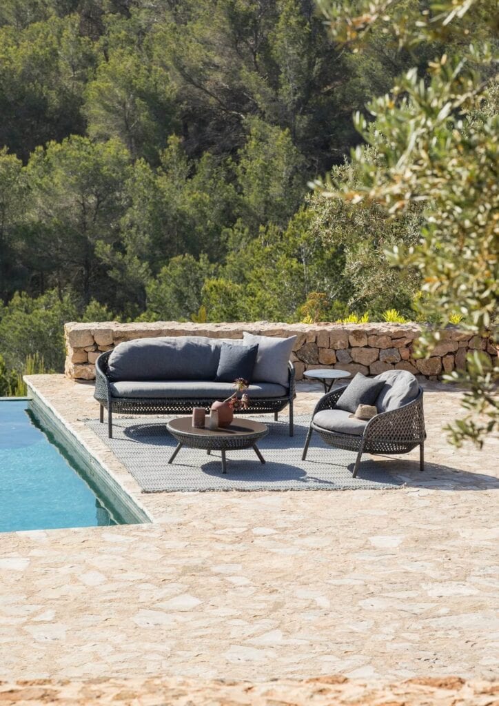 Mit AHNDA hat Stephen Burks eine weitere Neuheit für DEDON kreiert: einen vielseitigen Outdoor-Lounger in kultigem Stil, mit unübertrefflichem ergonomischem Komfort und Liebe für luxuriöse Details. Die AHNDA Kollektion umfasst Sessel, Hochlehner sowie einen passenden Hocker und Kaffeetisch. Die Möbel sind aus wetterfester DEDON Faser gefertigt und das ‚transparente‘ Design vermittelt ein Gefühl von Leichtigkeit. Bei näherer Betrachtung offenbart die ANDHA Kollektion besondere Details: Die Prägung an den verstärkten Aluminiumbeinen spiegeln so das charakteristische Flechtmuster der AHNDA Kollektion wider, genauso wie die Zickzack-Naht an der Kopflehne. Ein beeindruckendes Beispiel der Handwerkskunst ist das geflochtene Muster. Es setzt sich aus drei roten Fasern in unterschiedlichen Schattierungenzusammen und verleiht der AHNDA Kollektion eine zarte aber dennoch starke Ausstrahlung. Die Neigung der Lehne lädt zum Entspannen ein, ist jedoch aufrecht genug, so dass man sich bequemmit anderen unterhalten kann. Dazu gibt es gemütliche Sitzpolster, ein behagliches Rückenkissen undzwei Kopflehnen in verschiedenen Stärken. Der zusätzliche AHNDA Hocker ist ebenfalls traditionell geflochten und im selben runden Design gehalten, wie der Sessel und der Hochlehner. Der Hocker ist ausserdem auch als Kaffeetisch mit einer einseitig hellrot eingefärbten Flachglasplatte erhältlich.