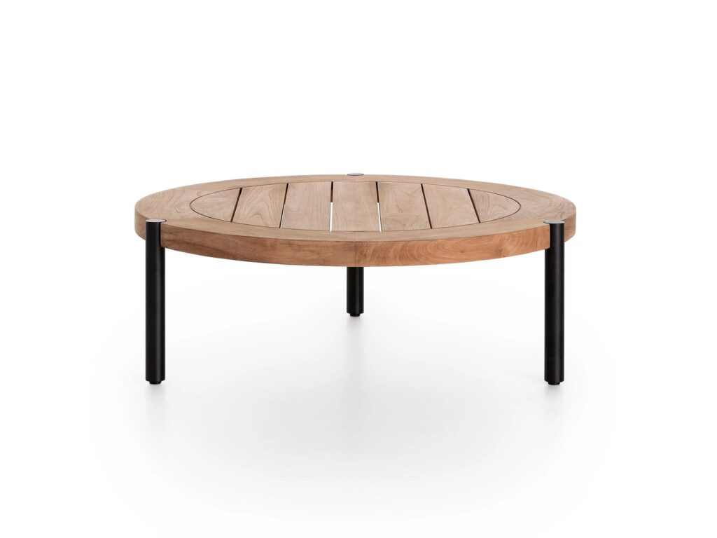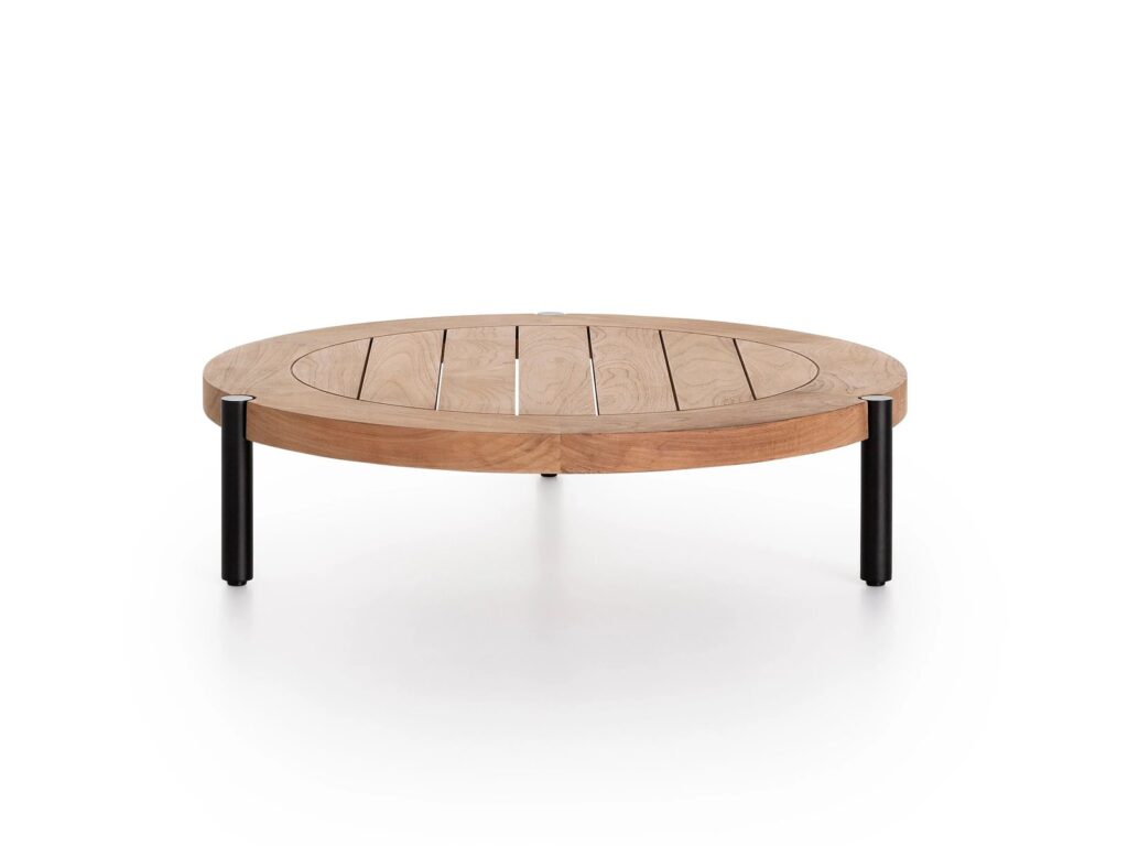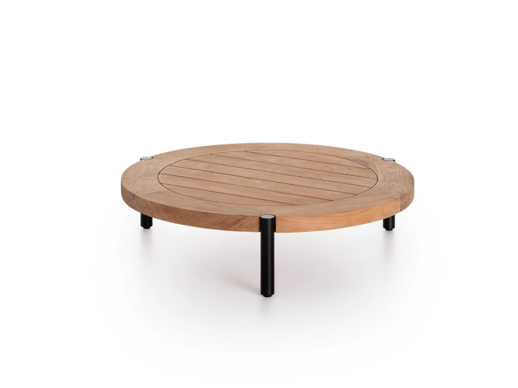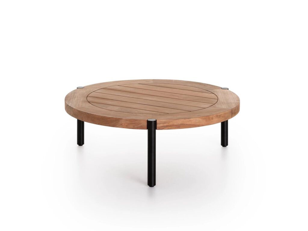 Lademadera ist ein niedriger Couchtisch mit einer Platte aus Teakholz und schwarz pulverbeschichtetem Aluminium. Er ist mit rechteckiger oder runder Platte erhältlich.