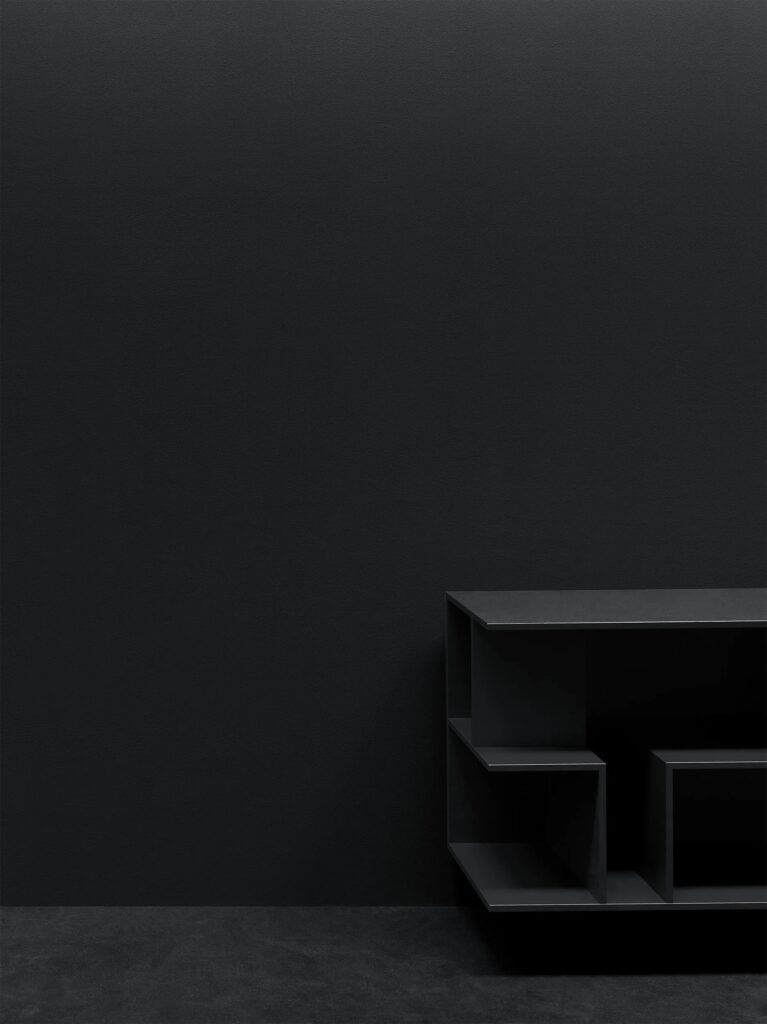 Wandhalterung: Stützrahmen, 12 mm dick, faltbar, "Sandwich" aus gepresstem und verleimtem MDF- und Aluminiumblech, mit einer in die Rückseite eingelassenen Stahlstange, die mit Gewindelöchern versehen ist, um sie durch einen MDF-Sockel an der Wand zu befestigen, mattschwarz lackiert, mit integriertem Haken und Neigungskontrollsystem (Höhe, Tiefe und Neigung).