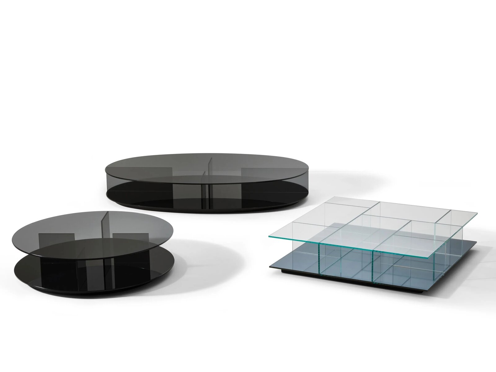 Die makellose Eleganz von Glas umhüllt die neuen Mex-Modelle , die mit einem 4 cm hohen, mattschwarz lackierten Metallfuss versehen sind. Dieses Detail hebt die Tische nicht nur über den Boden, sondern ermöglicht es auch, sie auf hochflorigen Teppichen zu schätzen, wodurch sie sich hervorragend in jeden Wohnraum einfügen.