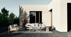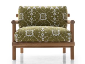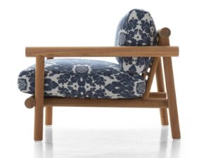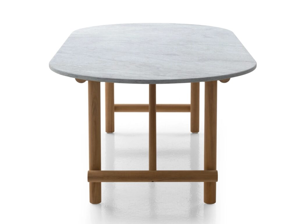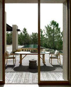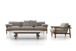 Die minimalistische und innovative Kollektion Ayana ist ein neues Kapitel in der Geschichte, die B&B Italia mit Naoto Fukasawa verbindet. Der Protagonist ist das Holz, das auf ungewöhnliche Weise interpretiert wird, mit einem angenehmen orientalischen Touch. Während die Tiefen und Höhen eine klare Referenz an die südostasiatische Tradition darstellen, erinnert die Rückenlehne an eine schwedische Sprossenwand, ein Trainingsgerät, das zu einem tragenden Element umfunktioniert wurde. Dank dieser Lösung können die Elemente der Ayana-Kollektion in einem 360-Grad-Winkel genossen und geschätzt werden, wobei auf jeder Seite ein neues elegantes Zusammenspiel von Überschneidungen und Proportionen zu entdecken ist. Die zwei- und dreisitzigen Sofas und der Sessel haben Armlehnen in unterschiedlichen Höhen. Die Armlehne des Sessels ist höher, um einen ergonomischeren Sitz zu gewährleisten. Die Armlehne des Sofas, die niedriger ist, kann mit einem Kissen kombiniert werden, das sich leicht befestigen und abnehmen lässt und bei Bedarf ein bequemeres Sitzen ermöglicht. Die Polstermöbel dieser Kollektion zeichnen sich durch individuelle Kissen aus, die alle mit wasserfesten Stoffen bezogen sind. Der warme Minimalismus von Ayana wird durch einen Stuhl, einen Esstisch und einen niedrigen Tisch ergänzt. Der Esszimmerstuhl greift die stilistischen Merkmale der anderen Sitzgelegenheiten auf, um ein perfektes Familiengefühl zu schaffen, mit einer Struktur aus natürlichem Teakholz und zwei großzügig gepolsterten Kissen mit Stoffbezug. Der Tisch besticht durch seine ovale Platte aus Serpentin, einem typischen Stein der Alpen. Die tragende Struktur aus natürlichem Teakholz wirkt leicht, ist aber äußerst robust, wetterfest und trägt die schwere Platte. Auch der Couchtisch hat eine runde Struktur aus natürlichem Teakholz mit einer Platte aus Serpentin. Seine großzügigen Abmessungen ermöglichen es, eine angenehme, gesellige Atmosphäre im Außenbereich zu schaffen. Ayana ist ein Projekt mit einer grünen Seele. Das für die Herstellung der Strukturen verwendete Teakholz ist FSC-zertifiziert (Forest Stewardship Council) und alle Materialien, aus denen die verschiedenen Elemente der Serie bestehen, können am Ende des Lebenszyklus des Produkts getrennt und umweltgerecht entsorgt werden.