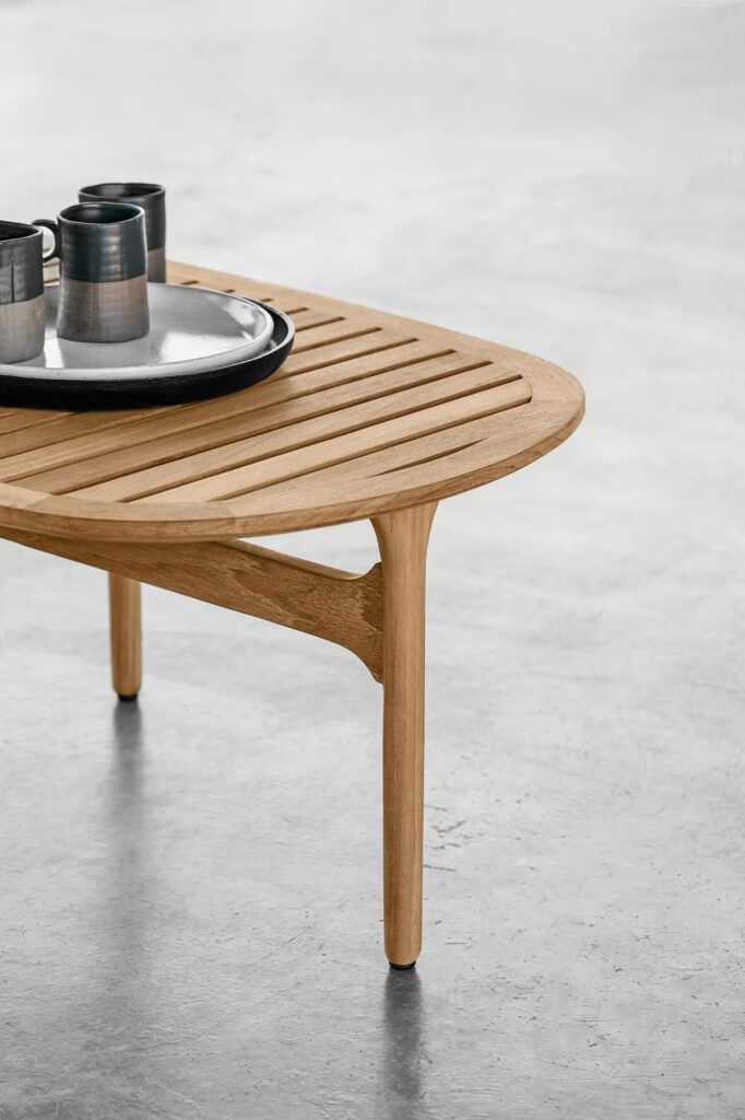 Bay - Niedriger ovaler Teakholz-Gartenbeistelltisch.