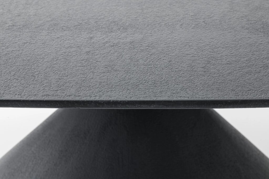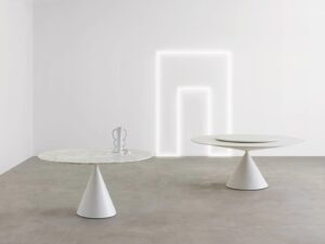 Tisch mit Basis aus hartem Polyurethan mit lackierter oder manuell gespachtelter Oberfläche, Ausführungen laut Preisliste. Runde oder elliptische Basis und Tischplatte. Tischplatten in Glas, Keramik oder MDF. Verfügbar für In- und Outdoor.