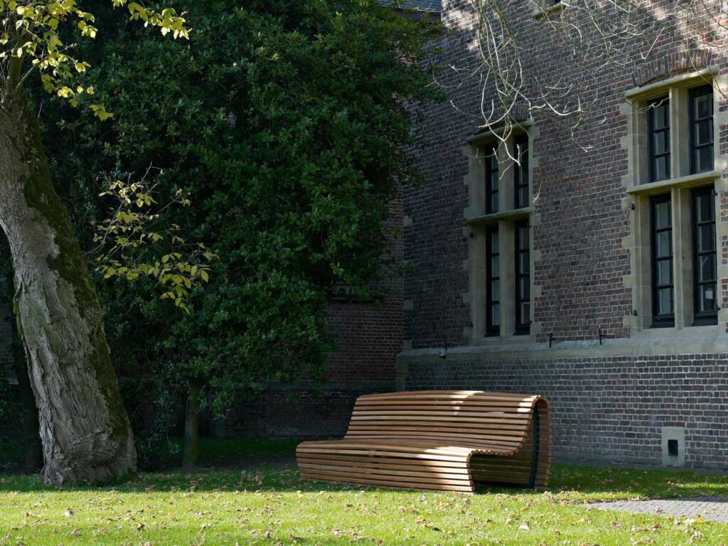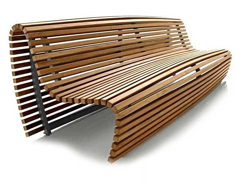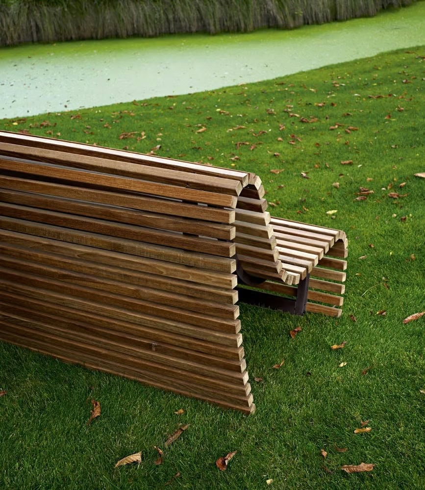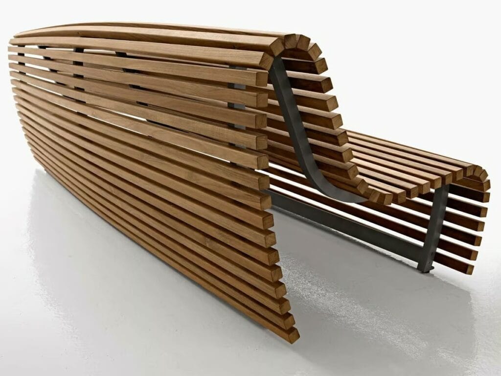 Die neue bank Titikaka aus teakholzleisten und mit gestell aus aluminium eloxiert steht im widerspruch zu der gewohnten bewegungslosigkeit dieser sitzmöbel. Möglicherweise waren die wellen des bolivianischen sees inspiration für dieses modell, dessen oberfläche einen interessanten bewegungseffekt zeigt, als ob der wind darüber hinweg streichen würde. Durch die auf beiden seiten der bank wellenförmig um die gestell herum laufenden leisten entstehen plastische kurven, die auch aus ergonomischer sicht zweckmässig sind.