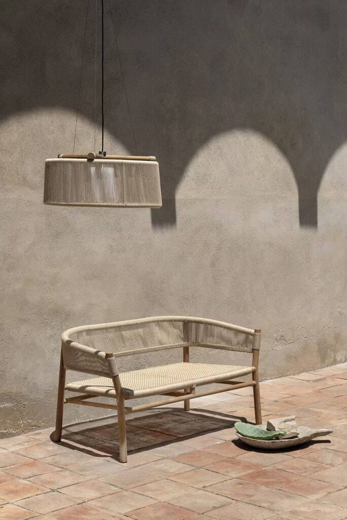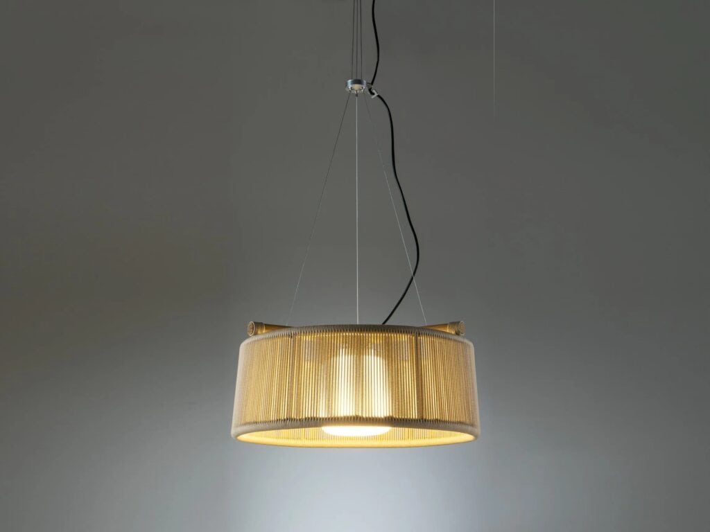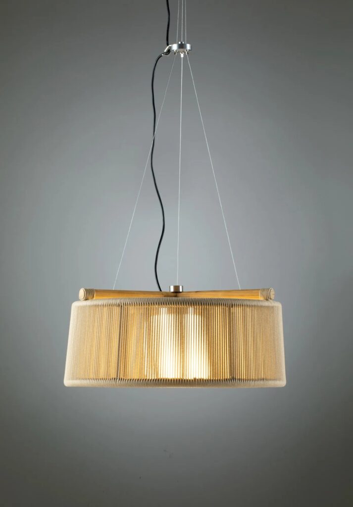 Dank des grossen Durchmessers der Leuchte breitet sich das Licht gleichmässig aus und der Diffusor mit opalem Finish schafft eine warme und einladende Atmosphäre. Das Seil spannt sich und umschlingt, wie auf einem Gestänge, den Teakholz-Lampenschirm, sodass das Licht gefiltert wird und angenehme Lichteffekte im Freien entstehen. Die auf diese Weise neu interpretierte Kollektion Kilt erreicht eine neue „Dimension“, mit der Veranden, Freisitze, Terrassen und Grossstadtbalkone beleuchtet und aufgewertet werden können. Ausserdem verleiht sie der Inneneinrichtung einen überraschenden und persönlichen Touch von Leichtigkeit und Modernität.