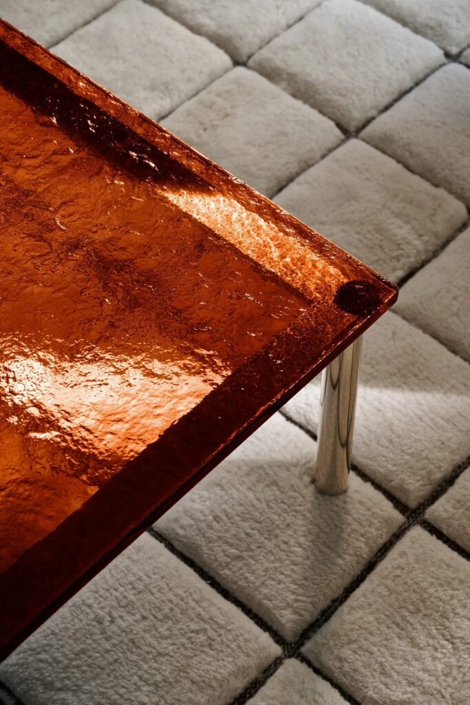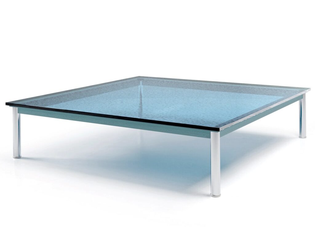 Das Modell, das in seinen Originalmassen als Schreibtisch diente, wurde von Charlotte Perriand 1984 überarbeitet und im folgenden Jahr von Cassina neu aufgelegt, um neue Varianten zu bieten und die Anforderungen einer Verwendung in der modernen Zeit zu erfüllen. Das essentielle Design des tragenden Gestells offenbart seine Einzigartigkeit in der Verchromung der aufrechten Hohlprofile aus Stahl und der farbigen Lackierung der Querstreben. Zur Serie gehören auch die quadratischen oder rechteckigen Tische und Beistelltische mit einer Tischplatte aus Kristallglas, Gussglas oder thermogeformtem Buntglas und Lackierung in den verschiedenen Farben der Farbpalette Le Corbusier.