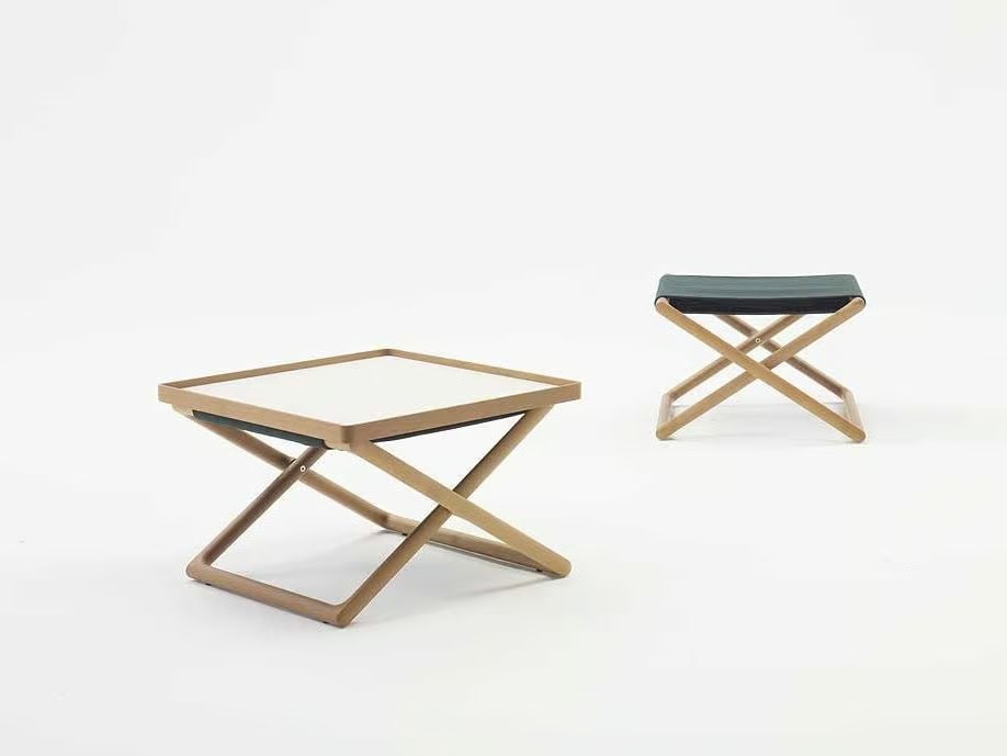 Portofino ist eine neue Sitzmöbelkollektion, bestehend aus einem Stuhl mit Armlehnen, einem Liegestuhl, einem Sessel und einem Hocker mit faltbarem Gestell aus Robinienkernholz; der abnehmbare Bezug ist in allen Outdoor-Stoffen der Kollektion erhältlich.