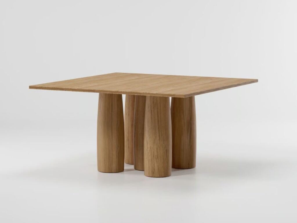 Eigentlich war die Idee, den Tisch ausschließlich in klassischen Materialien wie Marmor zu fertigen, aber für das zeitgenössische Modell greift Kettal auf zwei weitere Werkstoffe zurück, nämlich Teak und Zement.