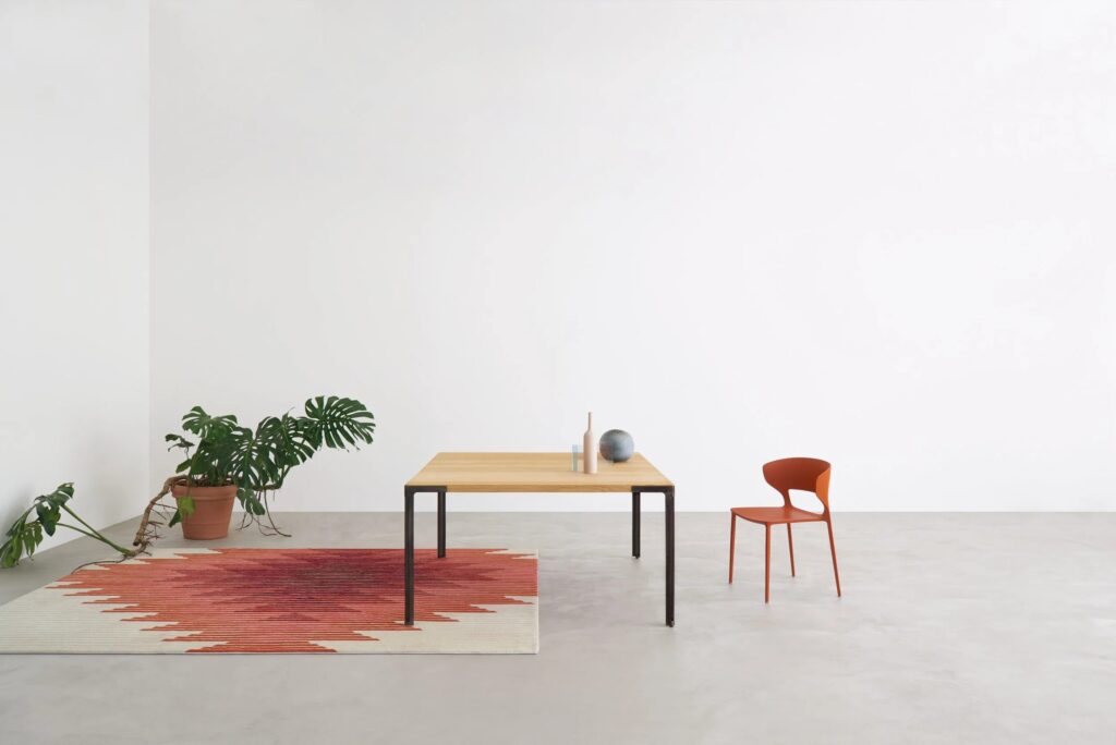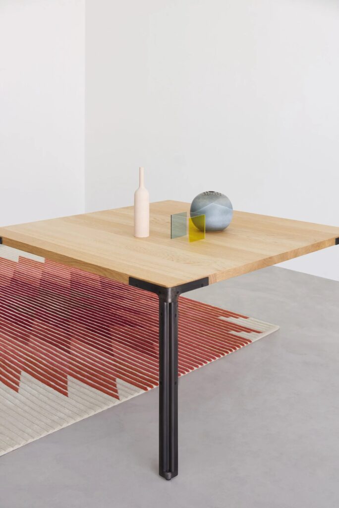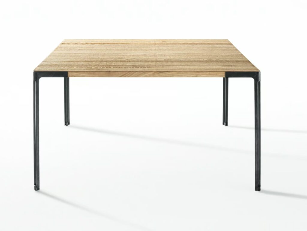 Tisch mit Beinen aus Stahlblech Roheisen lackiert. Verbundplatte aus Eiche-Massivholz mit sägerauer Oberfläche.