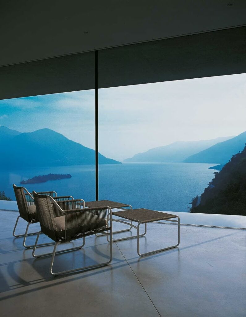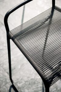 Polyester or acrylic filaments, with diameters of 3 or 7 mm, wrap around the metal tubes that define the continuous lines of the design. The neutrality of the design is highlighted in the cushions, thanks to the various finishes and color options available, while the lightness of the design is felt in the air that passes through it, making the cords vibrate.