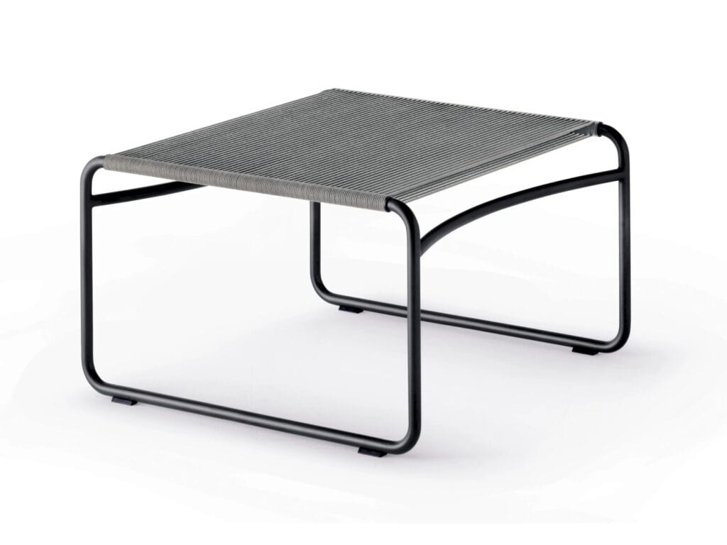 HARP 311 is a square garden footrest made of steel and rope.