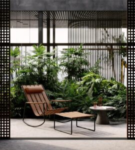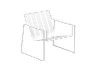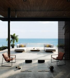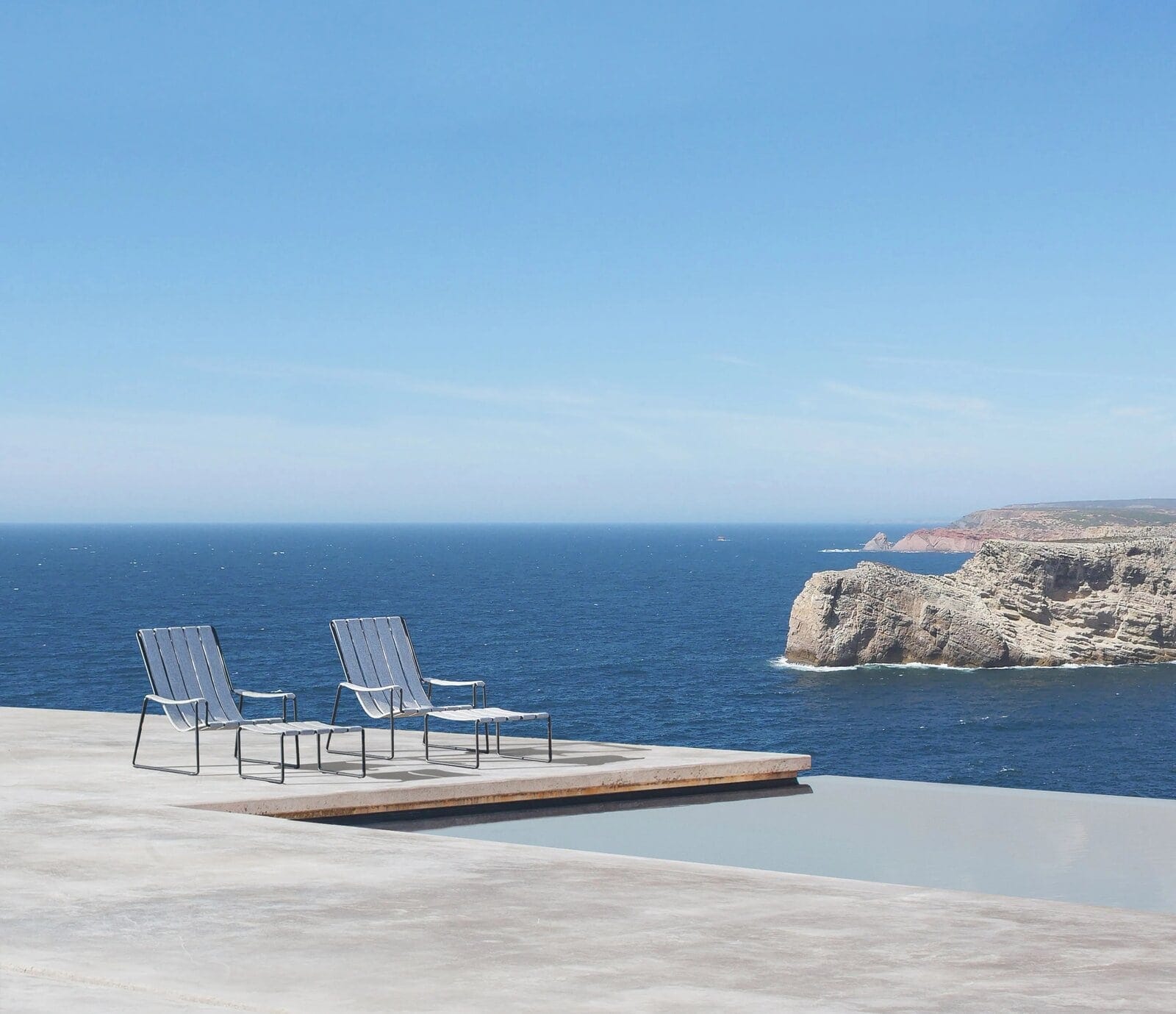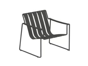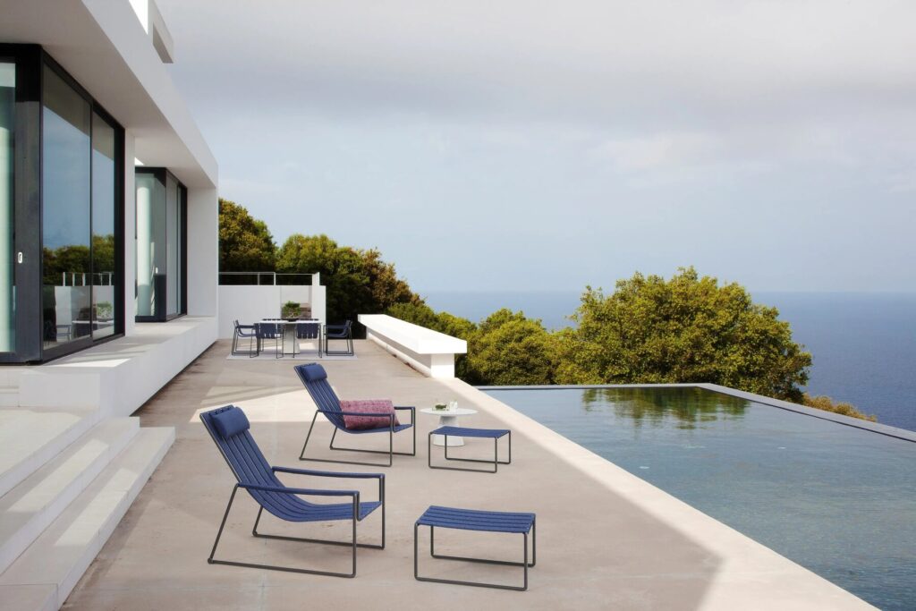 Die neue und höchst originelle Strappy-Kollektion verfügt über eine beschichtete Edelstahlstruktur, die aus einer durchgehenden Stange besteht, die rundherum verläuft und somit ein minimalistisches, aber funktionales und stapelbares Gestell bildet, an dem die gepolsterten Sitzgurte und Armlehnen befestigt sind. Sie wirken wie in diesem eleganten Gestell aufgehängt. Dass Vorder- und Rückseite nur durch weiche Elemente verbunden sind, ist jedoch eine optische Täuschung. Was ins Auge fällt, ist in der Tat die Polsterung, die Aluminiumgurte sind schön im Inneren versteckt. Zusammen mit der versteckten Armlehnenverbindung bilden sie das Rückgrat des Strappy. Dieser optische „Trick“ ermöglicht nicht nur ein sehr feines und zerbrechlich aussehendes Gestell, sondern sorgt auch für einen noch grösseren Vorteil. Die Polster können in kürzester Zeit zur Reinigung oder Winterlagerung entfernt werden. Mit einem zusätzlichen Set können Sie sogar das Aussehen des Strappy ändern, um den Farben der Saison zu folgen. Als ob die Auswahl von rund 70 verschiedenen Farben und Texturen für die Bezugstoffe nicht ausreichen würde, haben wir der Liste drei hochbeständige Kunstlederoptionen hinzugefügt. Der Strappy aus schwarzem, cognacfarbenem oder taupefarbenem Leder hebt sich wirklich von der Masse ab und verwischt die Grenze zwischen Innen- und Aussenmöbeln.