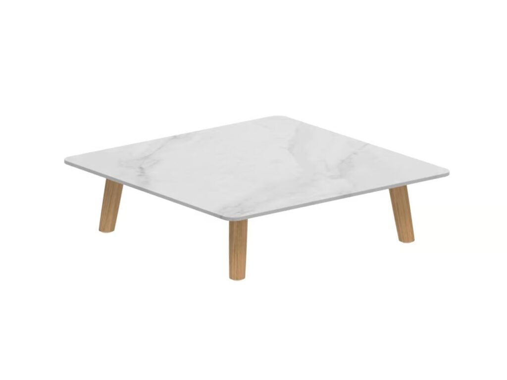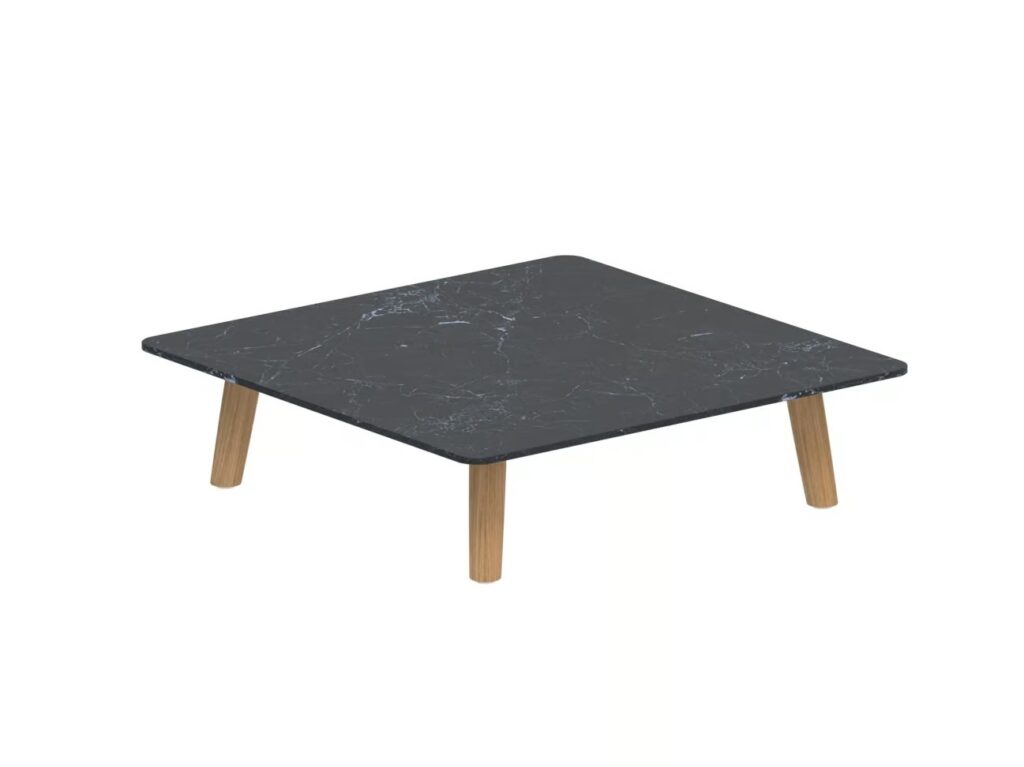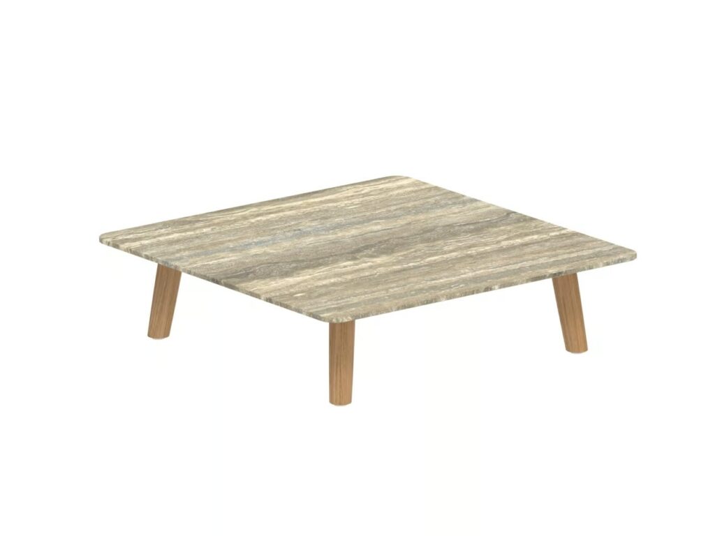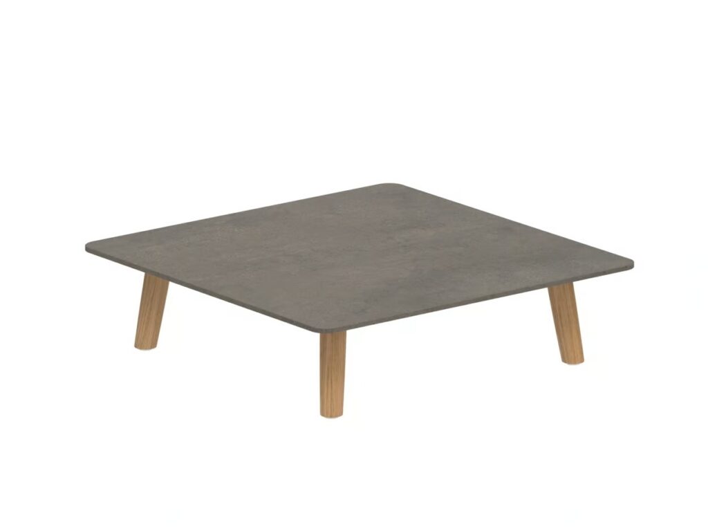 Mambo Lounge ist ein quadratischer Gartentisch. Er ist in verschiedenen Ausführungen erhältlich, die Platte kann aus Keramik oder Teakholz sein.