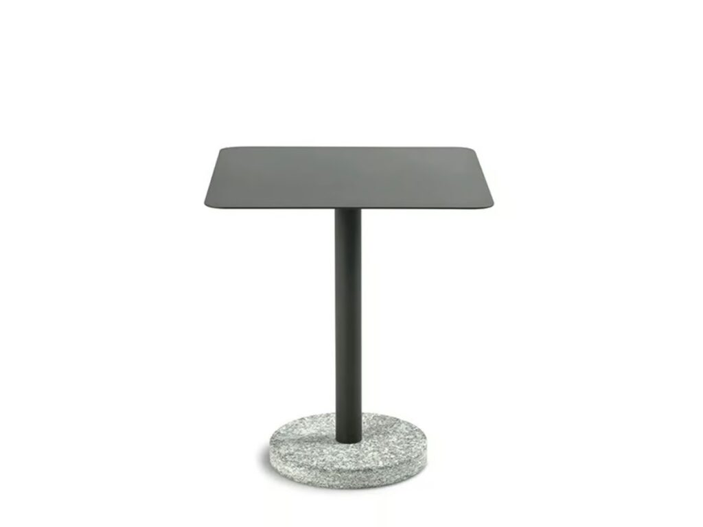 Quadratischer Tisch: HPL grau oder pulverbeschichtete Stahlplatte.