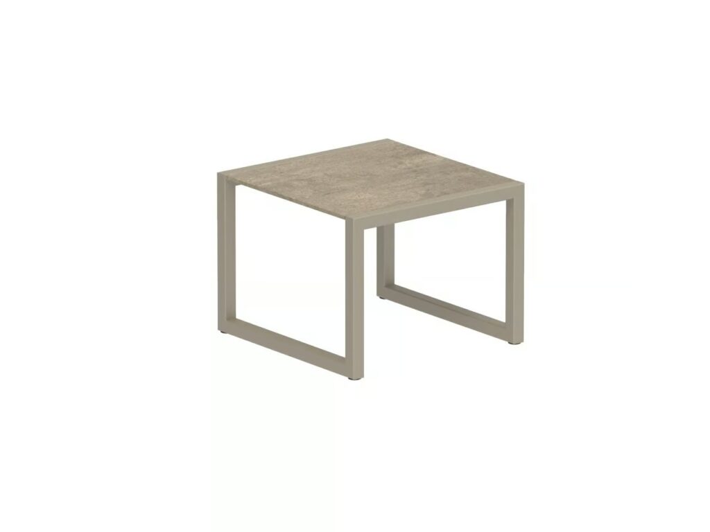 Ninix ist ein niedriger, quadratischer Gartentisch mit einem Kufengestell aus Edelstahl und einer Platte aus Keramik und Glas, der zur Kollektion NINIX gehört.