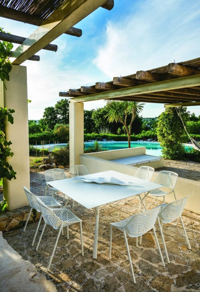 Die charakteristische Form der Beine von Radice quadra wurde durch das gleichnamige mathematische Zeichen inspiriert. Die Struktur - leicht und geometrisch, aus Aluminiumdruckguss - wird durch eine quadratische, rechteckige oder runde Platte ergänzt, um die unterschiedlichsten Bedürfnisse zu erfüllen und sich an alle Aussenbereiche anzupassen.