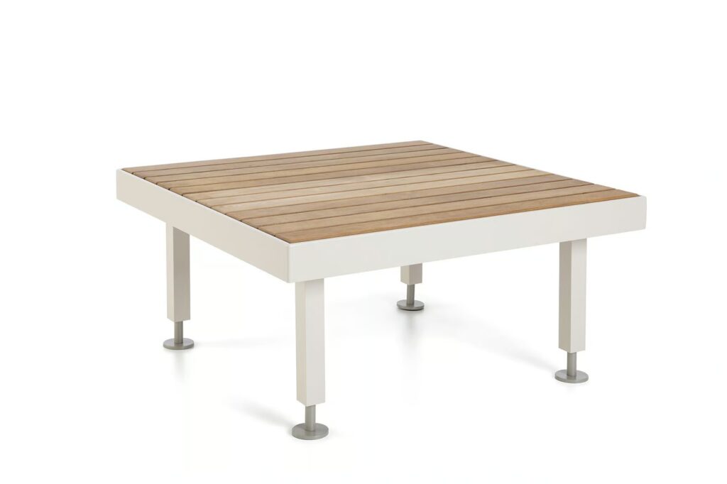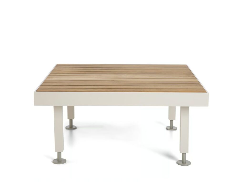 The tabletops are crafted either in terracotta or in natural teak slats. When laid side by side, the terracotta tiles form a seamless surface in either soft rose or variegated tones, with delicate white and grey veining.