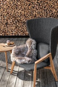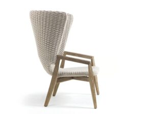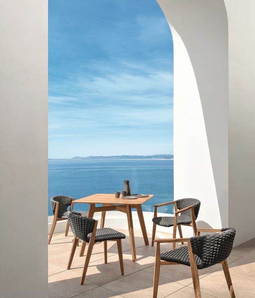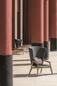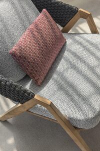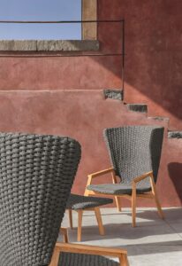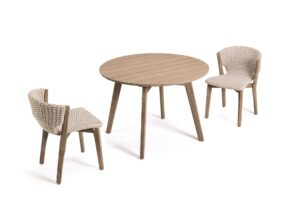 Die Kollektion Knit, erstmals vorgestellt auf der Mailänder Möbelmesse 2014, eröffnet die Zusammenarbeit zwischen Ethimo und dem französischen Stardesigner Patrick Norguet, der mit modernen, puristischen Formen und stofflichen Empfindungen einer besonderen Harmonie, Wärme und Schönheit nachspürt. Ethimo hat den Entwurf von Patrick Norguet, eine originelle Synthese aus Ästhetik und Funktionalität für das Leben im Freien, in Produkte verwandelt, die mit grösster Sorgfalt in jedem Detail ausgeführt sind: vom Gestell der Tische und Stühle aus Teakholz bis zum synthetischen Flechtwerk des Lehnstuhls, auf elegante Weise ideal für Garten und Terrasse. Knit ist nicht nur raffiniert, sondern auch intelligent in jedem Detail; so der mittlere Schlitz im runden Klapptisch, der als Griff für seinen Transport verwendet werden kann.