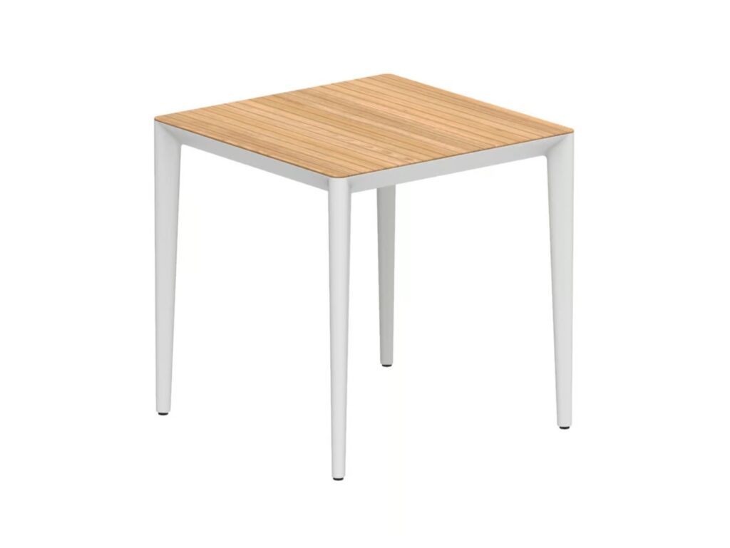 Purismus und Raffinesse: Zwei Stileigenschaften, die die Tischkollektion U-nite von Royal Botania am besten beschreiben. Bei der Ausführung aus beschichtetem Aluminium sitzt die Tischplatte im Inneren des Gestells, so dass nur die Oberseite sichtbar ist. Dieses Merkmal sorgt für ein sehr reines und klares Aussehen. Die Rahmen gibt es in fünf rechteckigen Grössen und einer runden, mit einer grossen Auswahl an Keramik oder Teakholz für die Platten. Auch die rechteckigen werden mit einem stabilen und dennoch eleganten Teakholzrahmen geliefert. Lassen Sie uns also stilvoll um einen dieser exquisiten U-Nite-Tische versammeln.