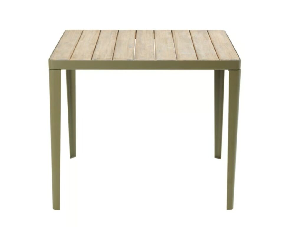 Tisch mit Metallstruktur und Platte aus gebeiztem Teakholz.