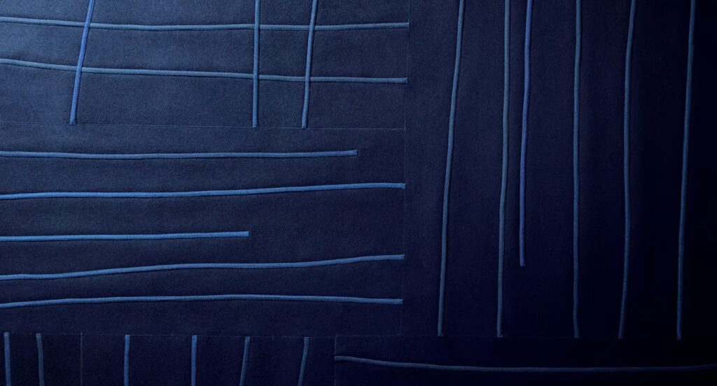 Dieser Teppich entsteht durch das Zusammenfügen von Filzelementen mit unterschiedlichen Abmessungen und gleicher Farbe mit einem applizierten Muster. Wollschnüre in verschiedenen Farben werden mit unterschiedlichen Neigungen auf jedes Element genäht, das die Oberfläche des Teppichs mit Punto Zigzag nach einem vorher festgelegten Muster bildet. Die Elemente werden dann mit Punto Zigzag zusammengenäht. Die Anzahl der Motive variiert je nach Größe des Teppichs. Die Bordüre ist mit dem Punto Pettine versehen.