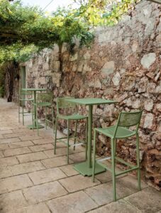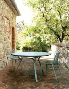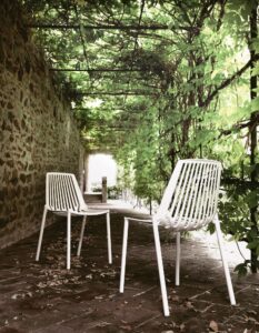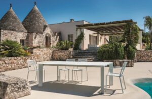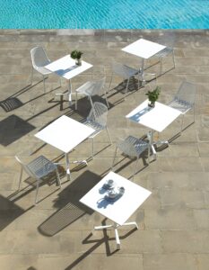 Omnia umfasst: Stühle, Stühle mit Armlehnen, Hocker, Tische und Couchtische für den Aussenbereich, Bänke, Liegen. Einige Modelle sind stapelbar und/oder können in Länge, Breite und Höhe individuell angepasst werden.