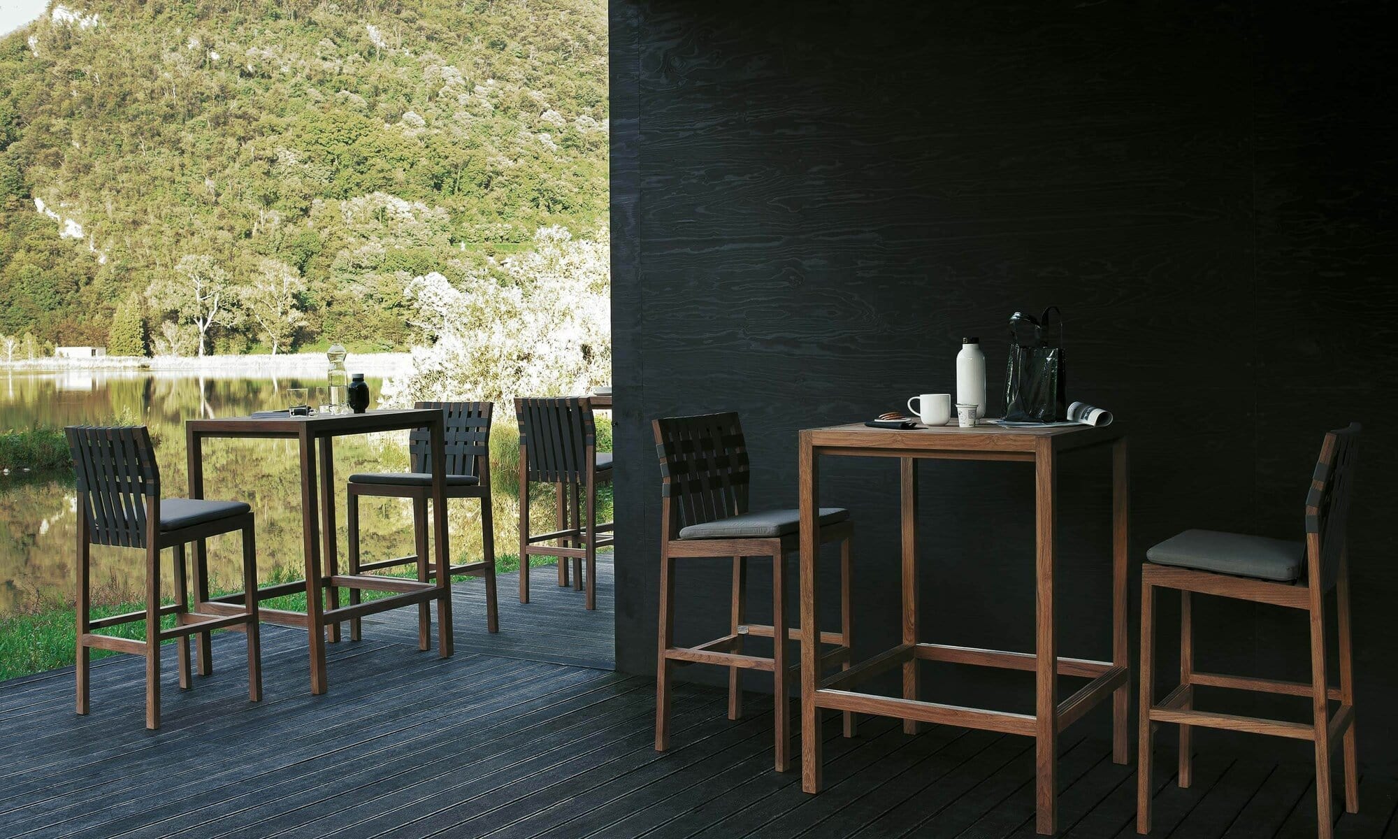 Thanks to its compact dimensions, these elegant high outdoor tables are ideal for contract environments and residential terraces and balconies of moderate size. Here, you can appreciate the full beauty of teak’s essence in a perfect chassis that geometrizes its function, halfway between a table and a stand-up, while the skeletal transparency fills its volume.