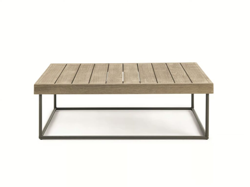 Rechteckige oder quadratische Couchtische aus Metall und gebeiztem oder natürlichem Teak.