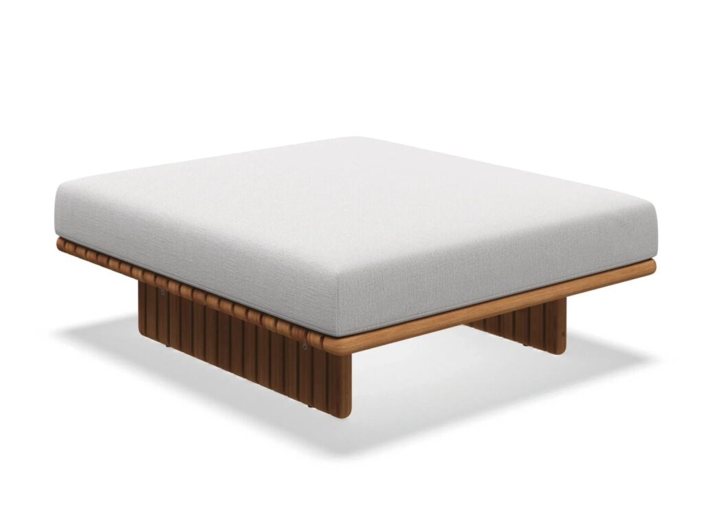 Deck - Quadratischer Gartenhocker aus Stoff und Teakholz.