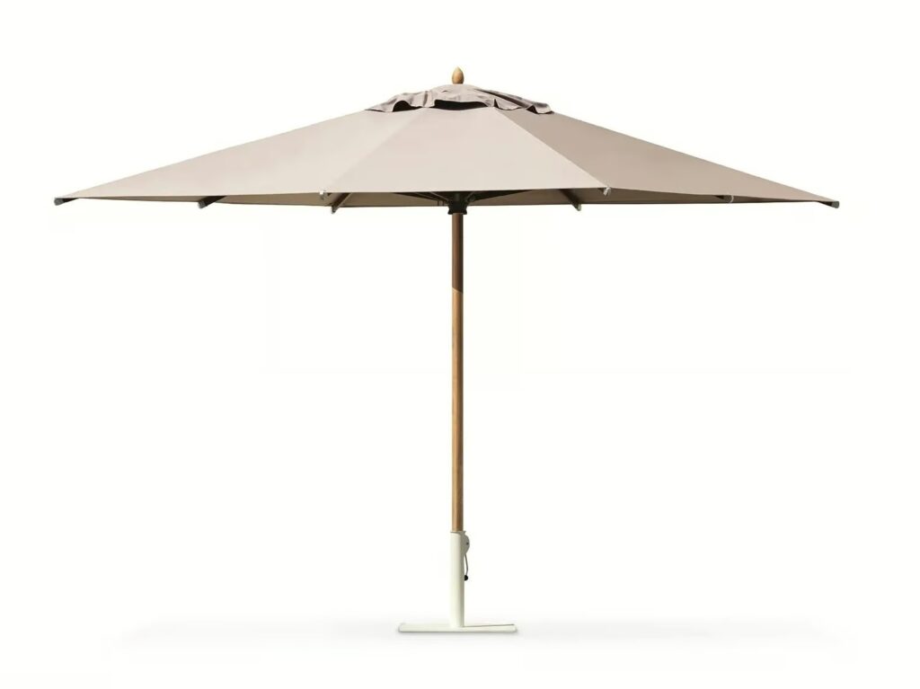 Viereckiger Sonnenschirm mit zentraler Stange und einem Flaschenzug zum Öffnen und Schliessen und Acryltuch in verschiedenen Farben, ohne Fuss.