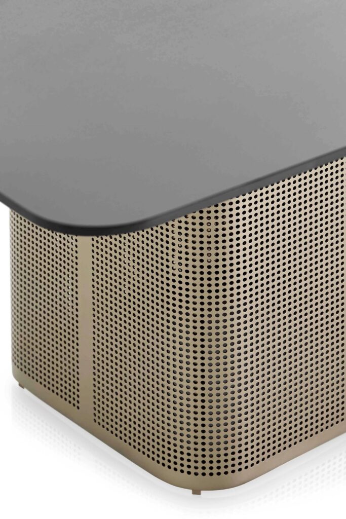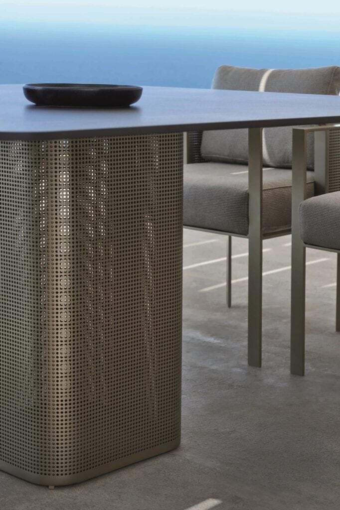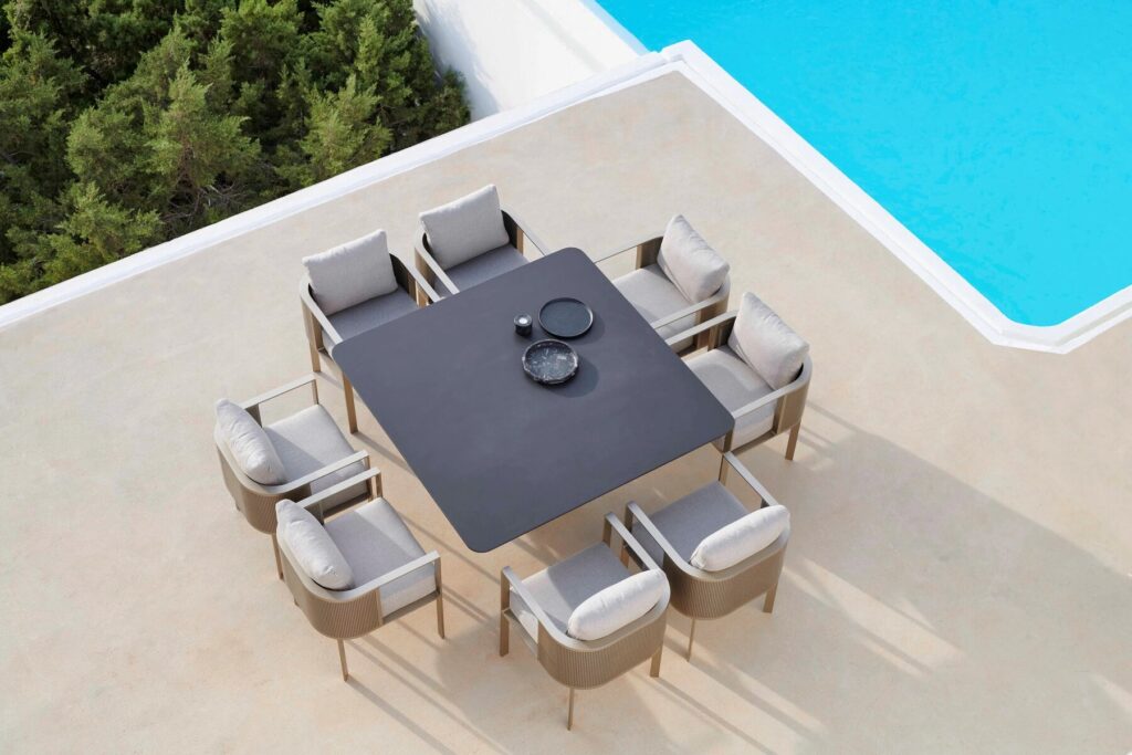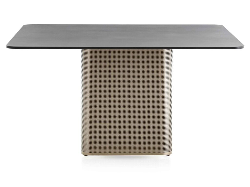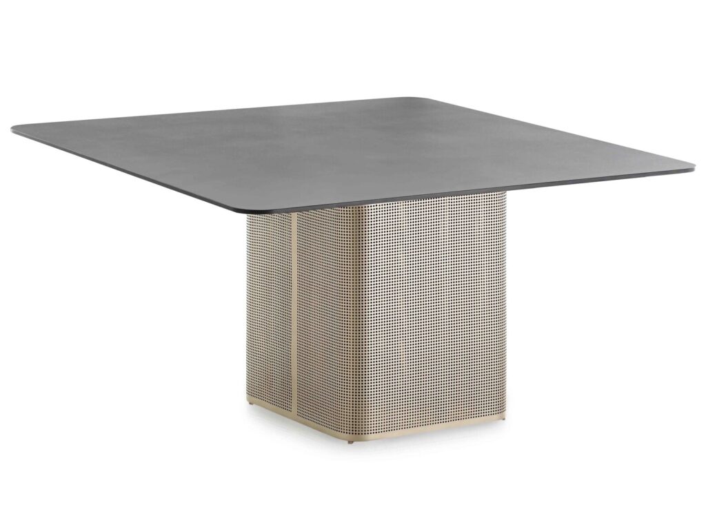 Der neue Tisch SOLANAS ist in zwei Varianten erhältlich, die sowohl die Geometrie des Fusses als auch die herrliche Tischplatte verändern: die quadratische Form mit abgerundeten Kanten (140 x 140 cm) oder die runde Form (140 cm Durchmesser).