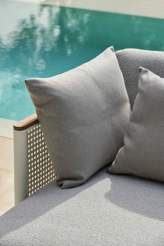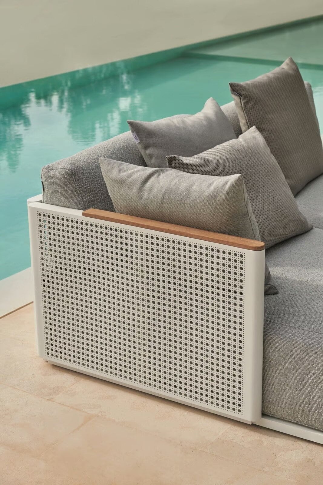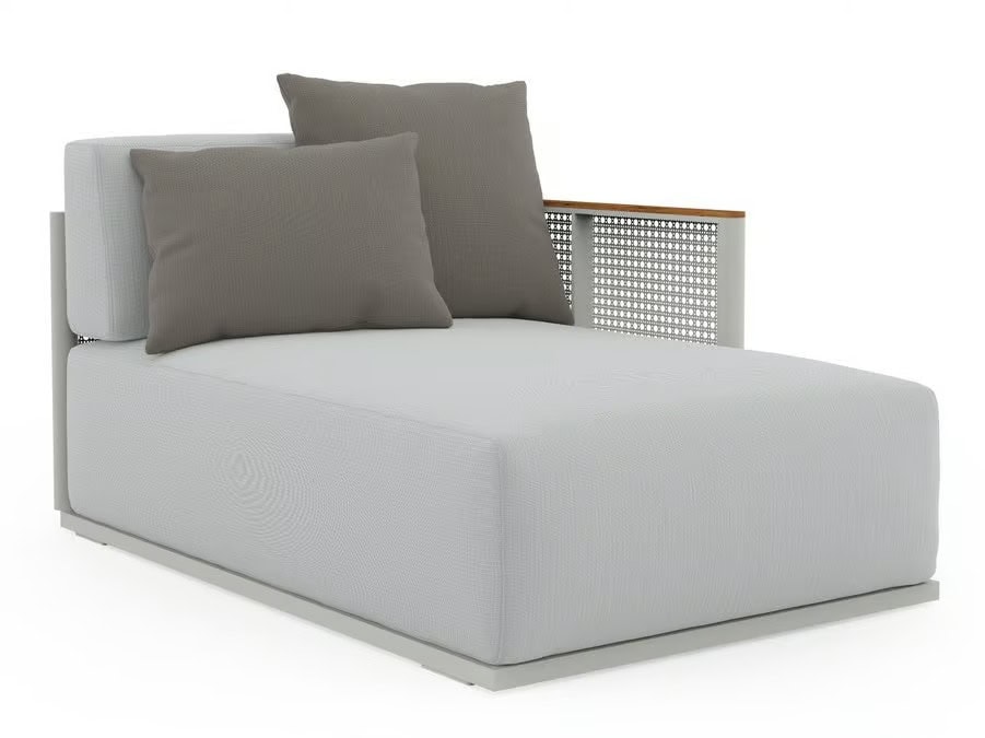 BOSC 2. Récamiere für den Garten aus Stoff und Thermolackiertem Aluminium. Mit iroko armlehne. Erhältlich Armlehne links oder Armlehne rechts.