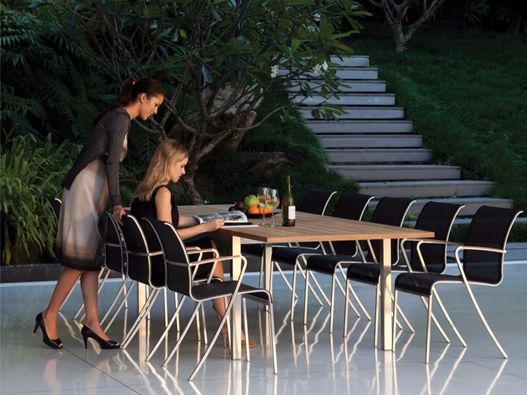 Taboela müsste eines der grössten Tischsortimente auf dem Markt sein. Grössen von 80 bis 340 cm, mit Gestelloptionen aus Edelstahl oder beschichtetem Aluminium und einer grossen Auswahl an passenden Platten aus Glas, Keramik oder Teakholz. Nicht zu vergessen: die zwei Grössen der cleveren Ausziehtische. Sicherlich gibt es für jede Terrassengrösse eine passende Taboela.