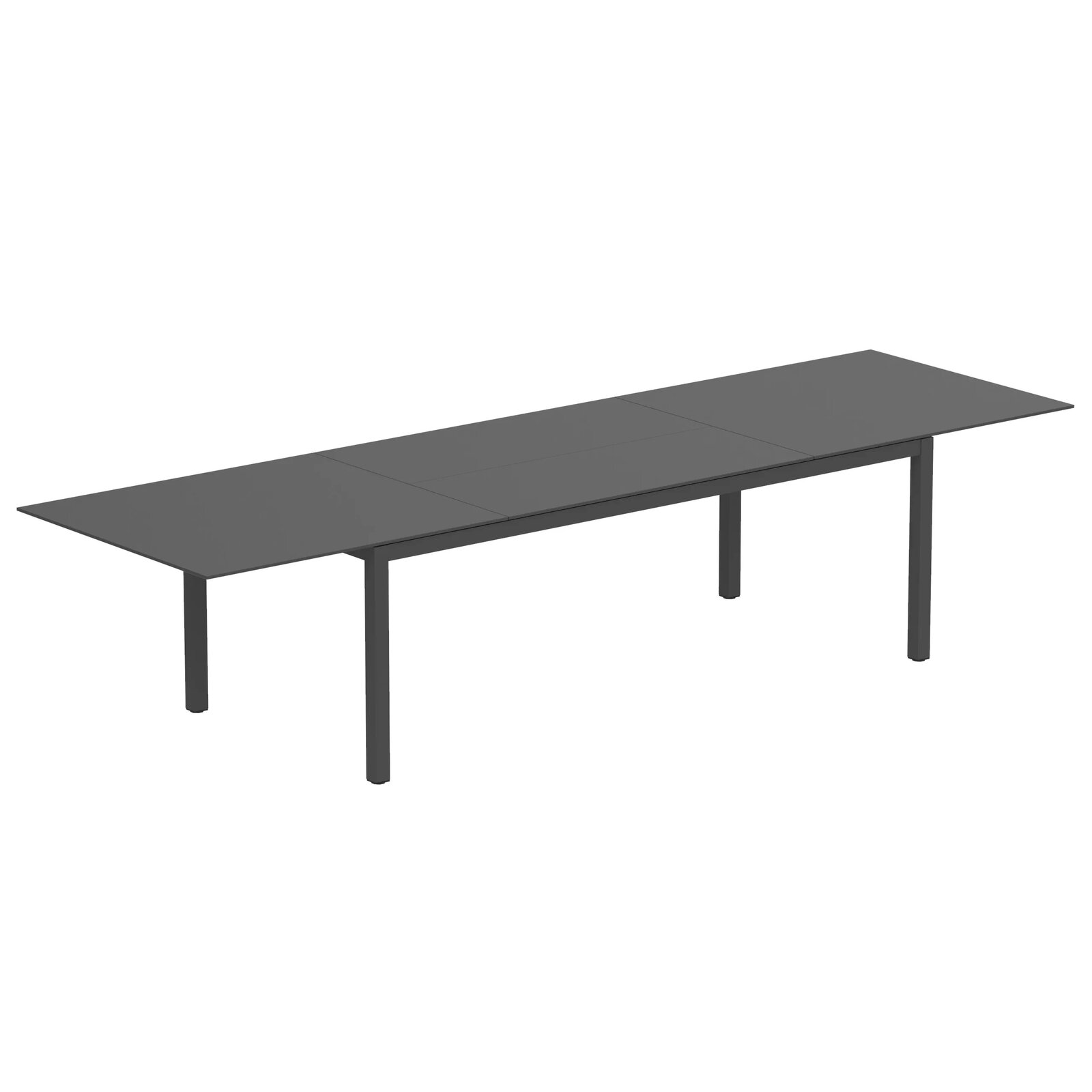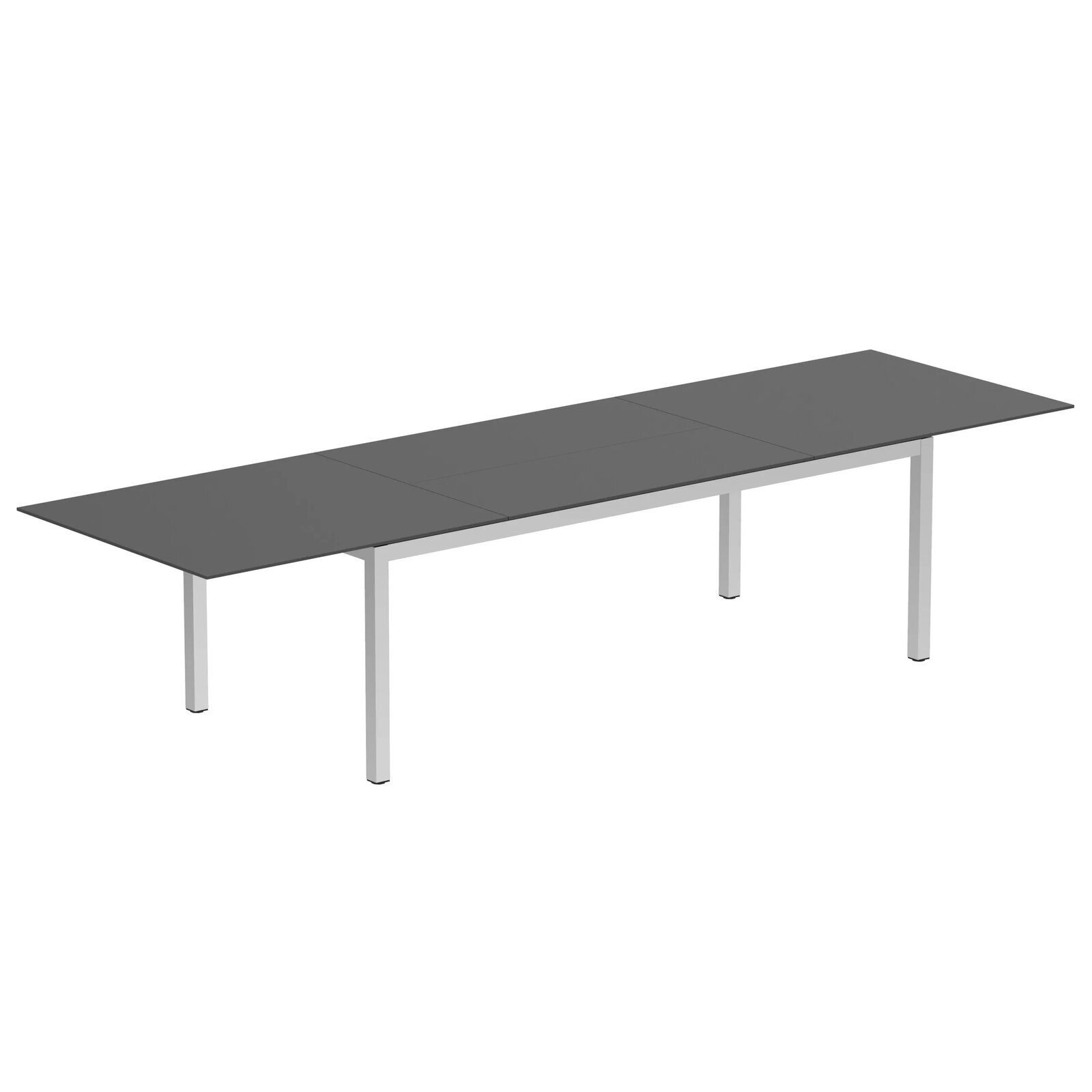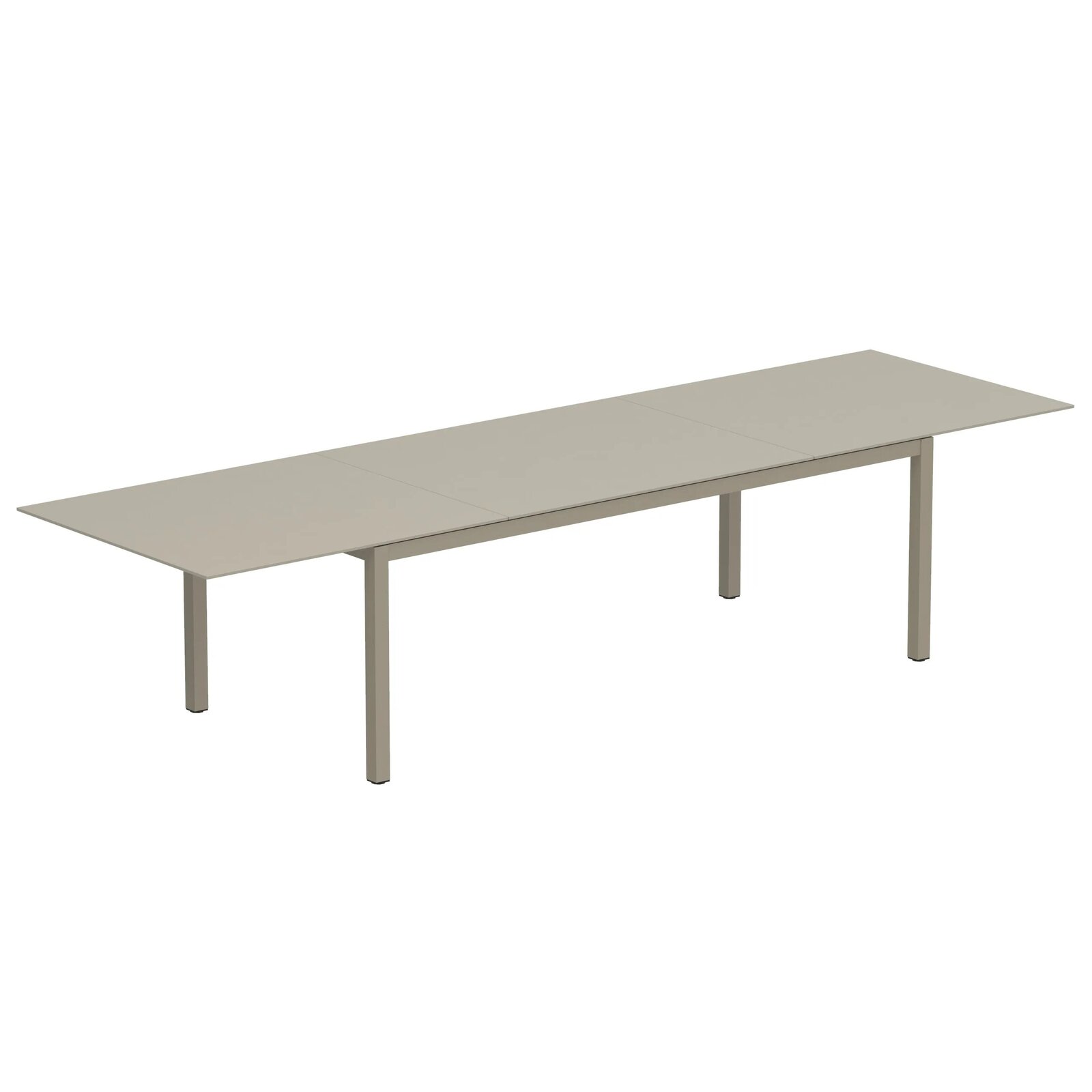 Taboela müsste eines der grössten Tischsortimente auf dem Markt sein. Grössen von 80 bis 340 cm, mit Gestelloptionen aus Edelstahl oder beschichtetem Aluminium und einer grossen Auswahl an passenden Platten aus Glas, Keramik oder Teakholz. Nicht zu vergessen: die zwei Grössen der cleveren Ausziehtische. Sicherlich gibt es für jede Terrassengrösse eine passende Taboela.