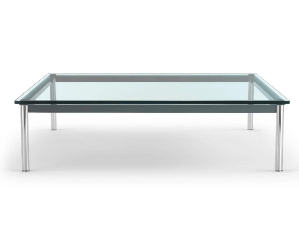 Le Corbusier, Charlotte Perriand und Pierre Jeanneret präsentierten die erste Version dieses Tischs 1929 im Salon d'Automne in Paris als Teil der Ausstellung "Equipement Intérieur d'une Habitation". Das Modell, das in seinen Originalmassen als Schreibtisch diente, wurde von Charlotte Perriand 1984 überarbeitet und im folgenden Jahr von Cassina neu aufgelegt, um neue Varianten zu bieten und die Anforderungen einer Verwendung in der modernen Zeit zu erfüllen. Das essentielle Design des tragenden Gestells offenbart seine Einzigartigkeit in der Verchromung der aufrechten Hohlprofile aus Stahl und der farbigen Lackierung der Querstreben. Zur Serie gehören auch die quadratischen oder rechteckigen Tische und Beistelltische mit einer Tischplatte aus Kristallglas, Gussglas oder thermogeformtem Buntglas und Lackierung in den verschiedenen Farben der Farbpalette Le Corbusier.