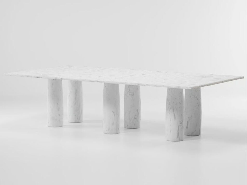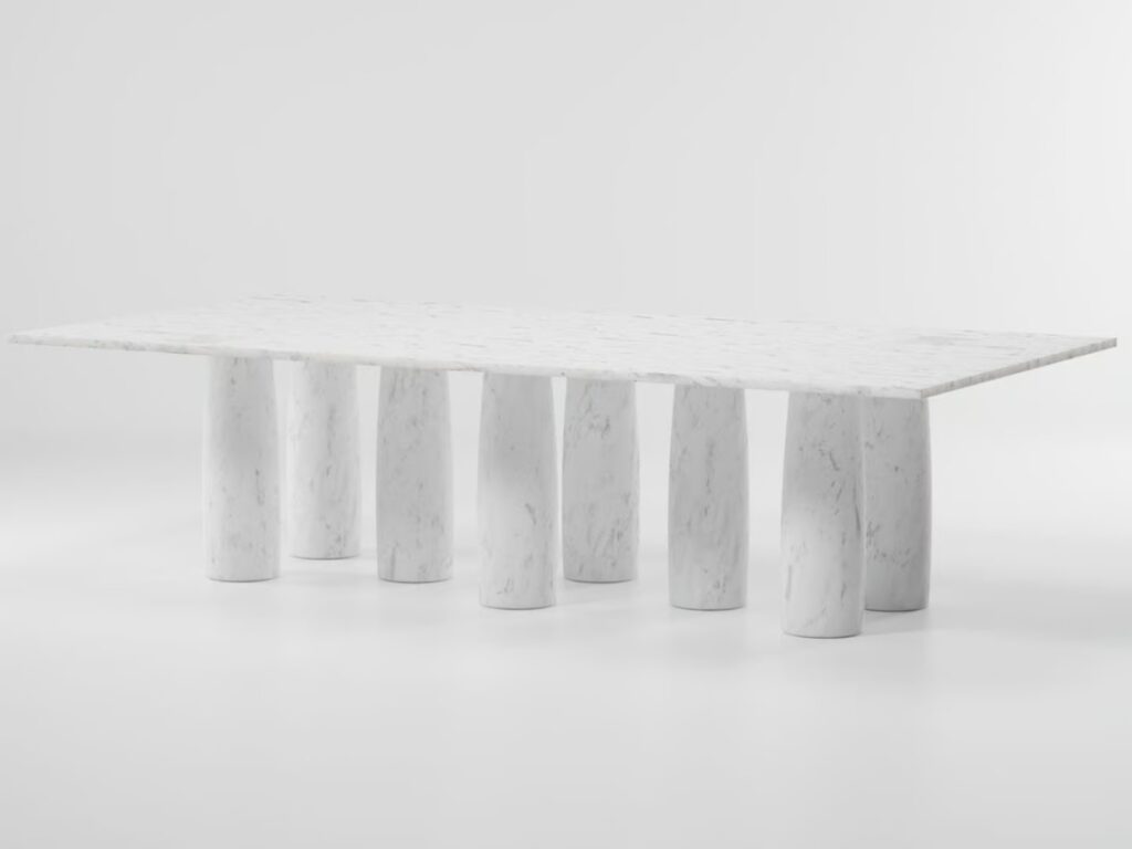 Für dieses Projekt wurde Mario Bellini von einer elementaren und grundlegenden architektonischen Struktur inspiriert. Das Design ahmt die klassische Architektur nach, bei der eine Reihe von Säulen einen Torbogen stützt, in diesem Fall eine Tischplatte.