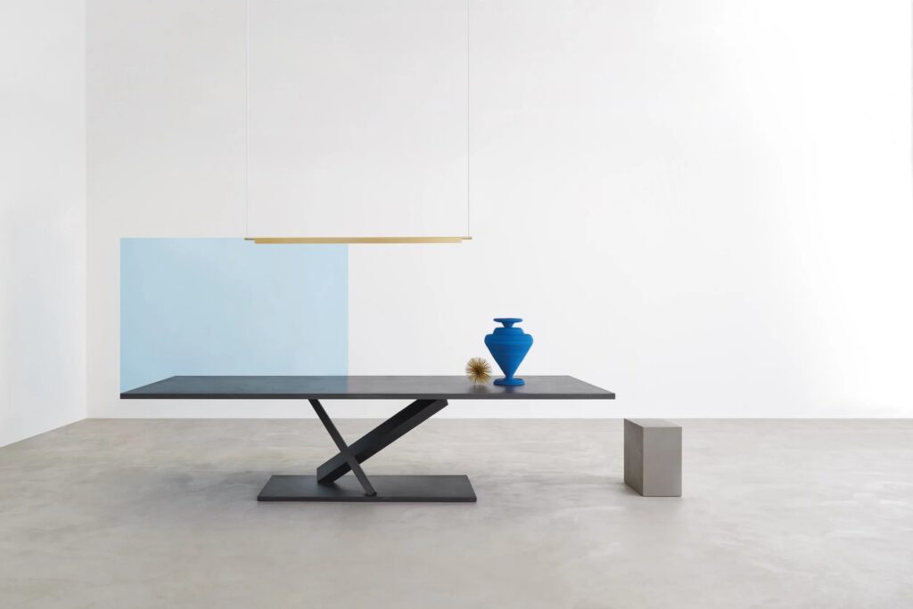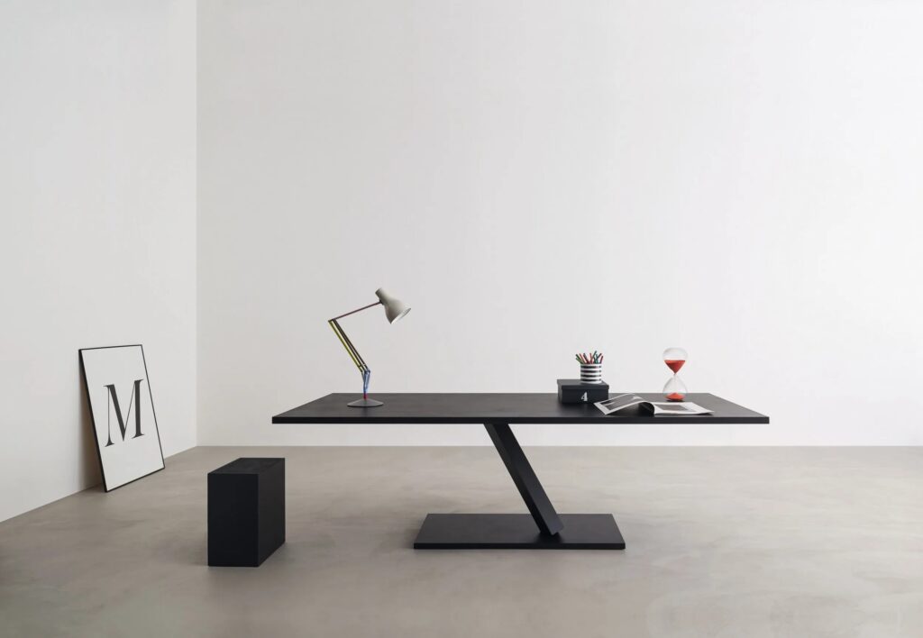 Tisch mit Stahlgestell, Tischplatte aus Metall oder MDF, mit lackierten oder manuell gespachtelter Oberfläche.