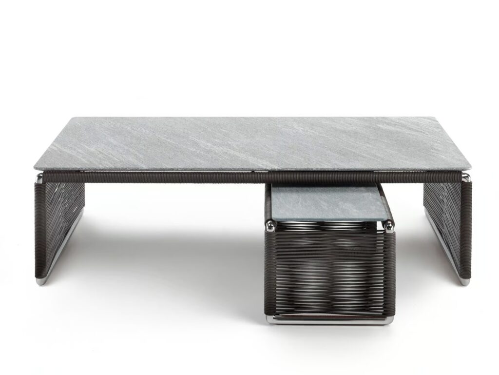 Die Beistelltische Tindari Outdoor sind der perfekte Vertreter für das Thema Geflecht, das Flexform wirklich am Herzen liegt. Das Gestell der Beistelltische besteht aus extrudiertem Aluminiumprofil mit Pulverbeschichtung in den Farben Weiß, Kaki, Weinrot, brüniert und Aluminium satiniert und ist komplett mit einem eleganten Geflecht aus Polypropylenfaser oder PU-Gummi bespannt, das in einer eleganten Farbpalette erhältlich ist, die von natürlichen Farbtönen bis Bordeaux und Olivgrün reicht. Das Geflecht, das von erfahrenen Handwerkern in Handarbeit ausgeführt wird, verleiht der Strenge des Metalls Wärme und erweckt diesen Tisch mit seiner unverwechselbaren Persönlichkeit zum Leben. Der Beistelltisch lässt sich perfekt mit den Sitzmöbeln der Kollektion Flexform Outdoor zu einer stilvollen und eleganten Einrichtung für die Terrasse oder die Veranda kombinieren. Die Beistelltische Tindari gibt es mit einer Tischplatte aus Grauem Beola, Lavastein, Porphyr oder Cardoso.