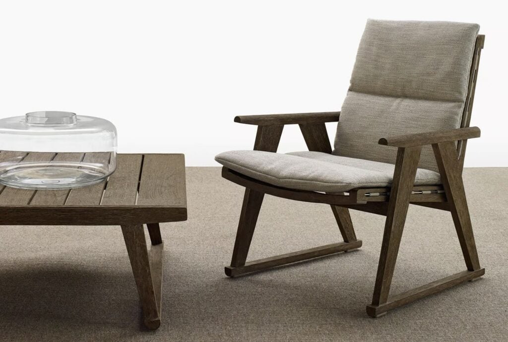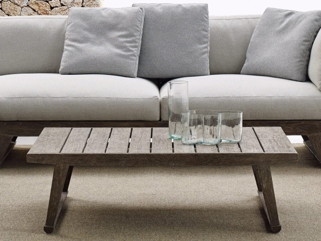 Gio, entworfen von Antonio Citterio, ist die neue Serie mit einem zeitgenössischen klassischen Akzent, die dem Leben im Freien gewidmet ist. Es handelt sich um eine komplette Reihe von Sofas, Endstücken, Chaiselongues, Liegen, Sesseln, Stühlen, Tischen und Ergänzungen, die aus massiven Teakholzstrukturen mit einer speziellen antikgrauen Oberflächenbehandlung entwickelt wurden, die dem Holz einen besonders lebendigen Aspekt und eine silbergraue Reflexionsqualität verleiht.