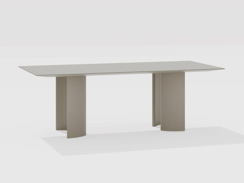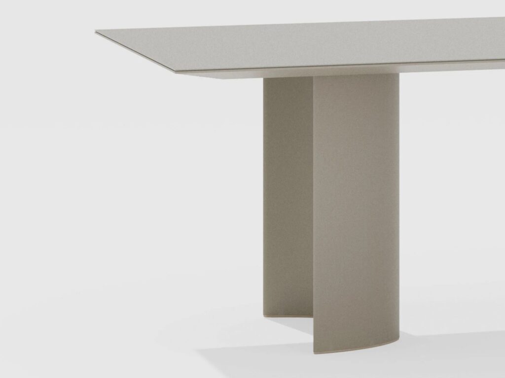Naca is a rectangular garden table made of powder-coated or spreckled aluminum.