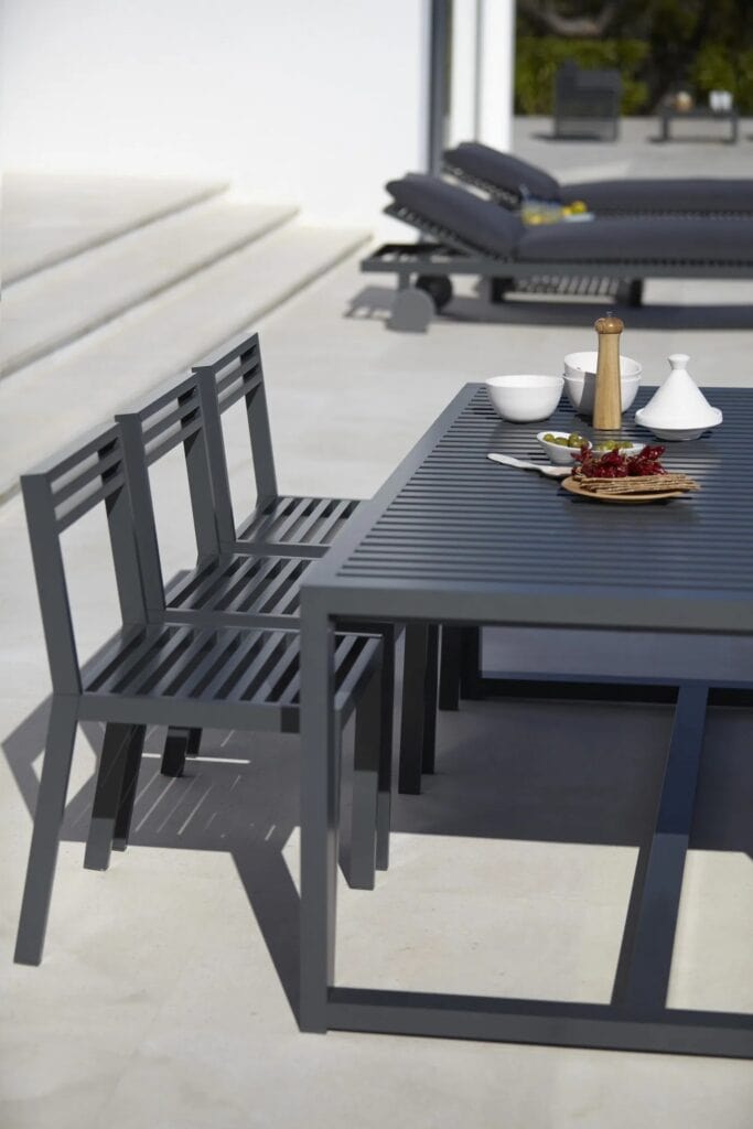 DNA ist eine Kollektion von Möbeln für den Aussenbereich, die durch das subtile Spiel der Licht- und Schattenmodulationen der mediterranen Fensterläden und das Lob des Schattens der japanischen Ästhetik in der traditionellen und zeitgenössischen Architektur inspiriert wurde – das Positive und das Negative ohne jede überflüssige Verzierung.