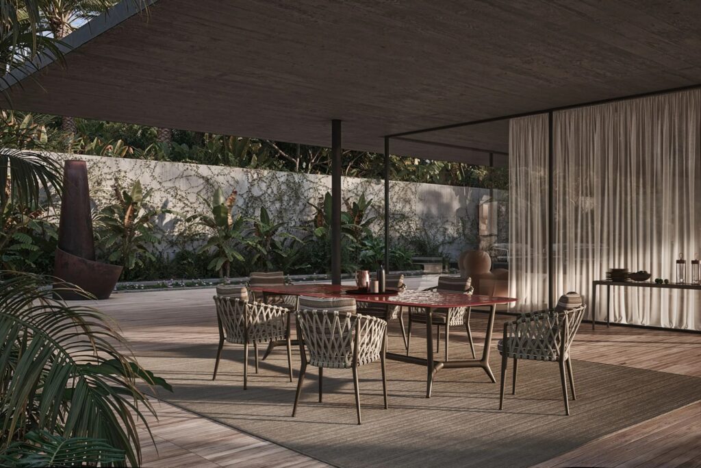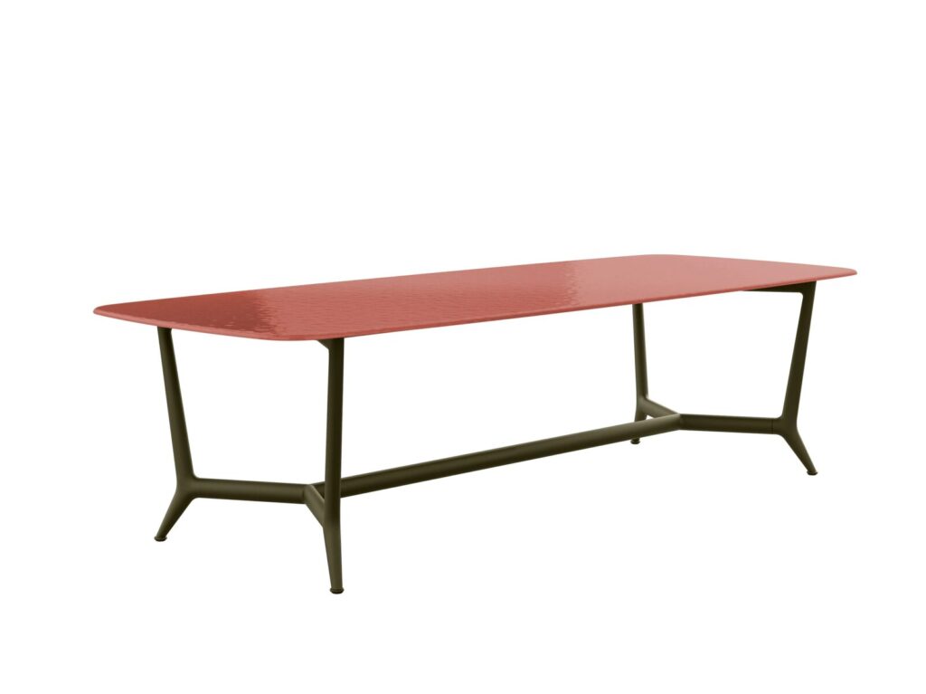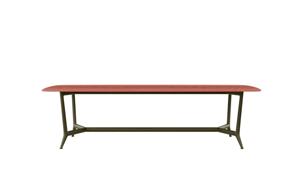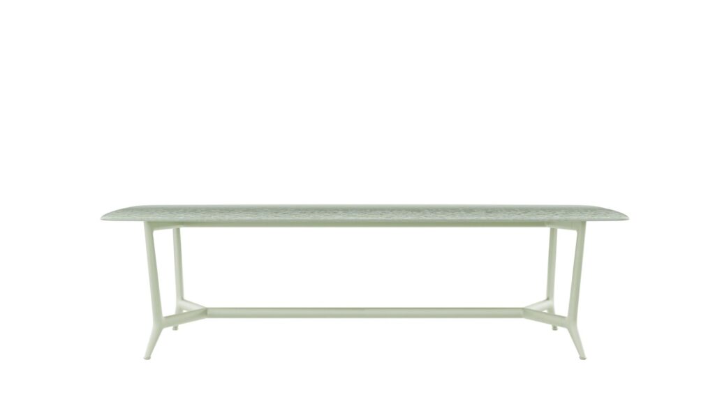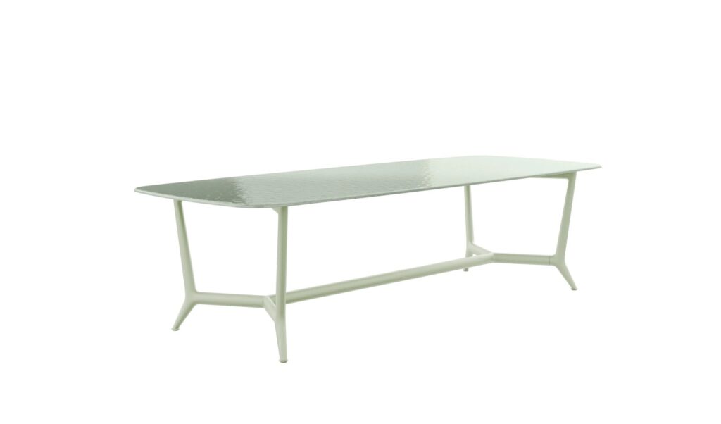 Die Esstische Erica werden in rechteckiger Ausführung in zwei Größen und in runder Ausführung in einer Größe angeboten. Sie kombinieren Gestelle aus pulverbeschichtetem Aluminiumdruckguss in fünf Farben - Anthrazit, Taubengrau, Olivbronze, Aquamaringrün, Cremeweiß - mit Lamellenplatten aus natürlichem Teakholz oder aus Schmelzglas - ein Verfahren, das Texturen und Unregelmäßigkeiten auf der Oberfläche für einen ausgeprägten haptischen Effekt erzeugt, die in den Farben Jadegrün, Smaragdgrün und Korallenrot nachlackiert sind.