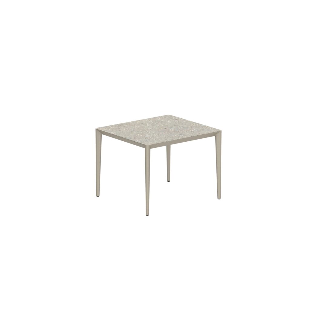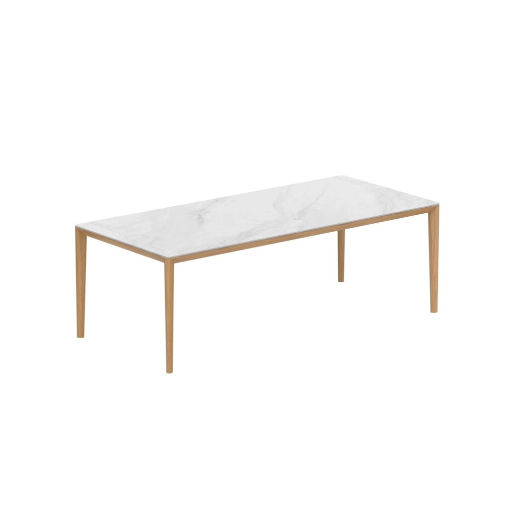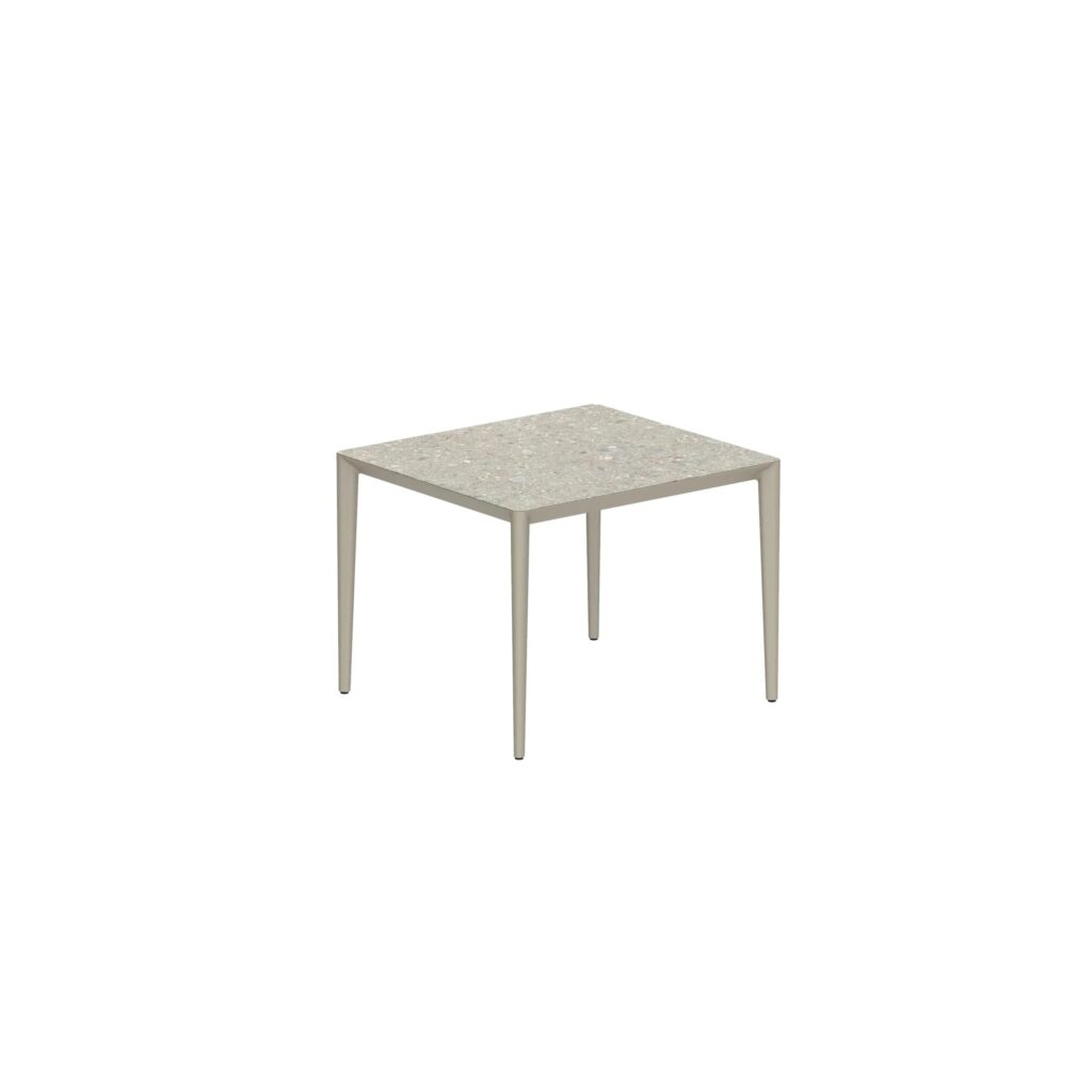 Purismus und Raffinesse: Zwei Stileigenschaften, die die Tischkollektion U-nite von Royal Botania am besten beschreiben. Bei der Ausführung aus beschichtetem Aluminium sitzt die Tischplatte im Inneren des Gestells, so dass nur die Oberseite sichtbar ist. Dieses Merkmal sorgt für ein sehr reines und klares Aussehen. Die Rahmen gibt es in fünf rechteckigen Grössen und einer runden, mit einer grossen Auswahl an Keramik oder Teakholz für die Platten. Auch die rechteckigen werden mit einem stabilen und dennoch eleganten Teakholzrahmen geliefert. Lassen Sie uns also stilvoll um einen dieser exquisiten U-Nite-Tische versammeln.