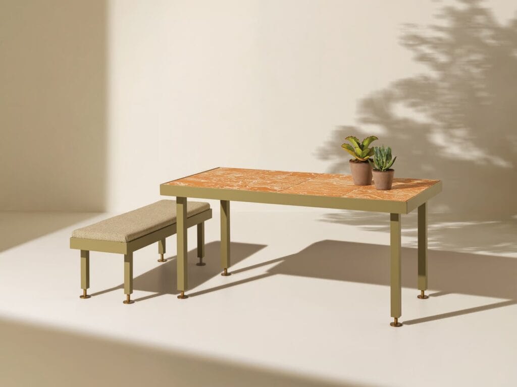 The tabletops are crafted either in terracotta or in natural teak slats. When laid side by side, the terracotta tiles form a seamless surface in either soft rose or variegated tones, with delicate white and grey veining.