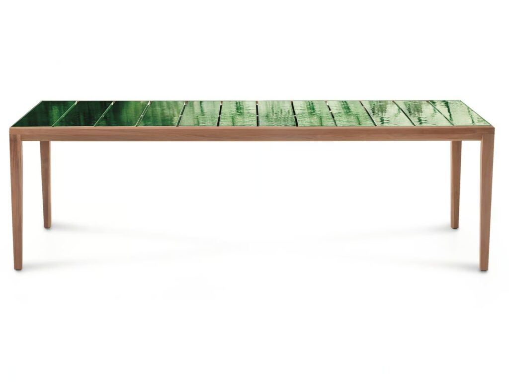The tables are part of a collection that showcases the brand's skill in innovation, combining natural materials with advanced technologies to create unique living and dining solutions for gardens and terraces. The tables feature a solid teak structure paired with a striking and original matte or glazed stoneware slat design for the table tops.