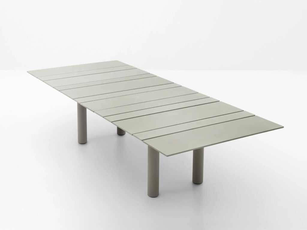 Dock is a dining table with a new concrete top. Structure in AISI 316 stainless steel painted matt in a colour matching the top, adjustable feet in stainless steel and rubber. Top composed of slats of different widths in Cementoskin® coloured concrete. The Dock table is always available also in the versions already in the collection, with base in glossy or matt painted steel and top in natural lava slats with Glacé finish or heat-treated ash Aurea Optima.